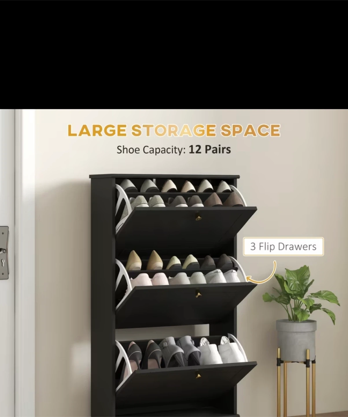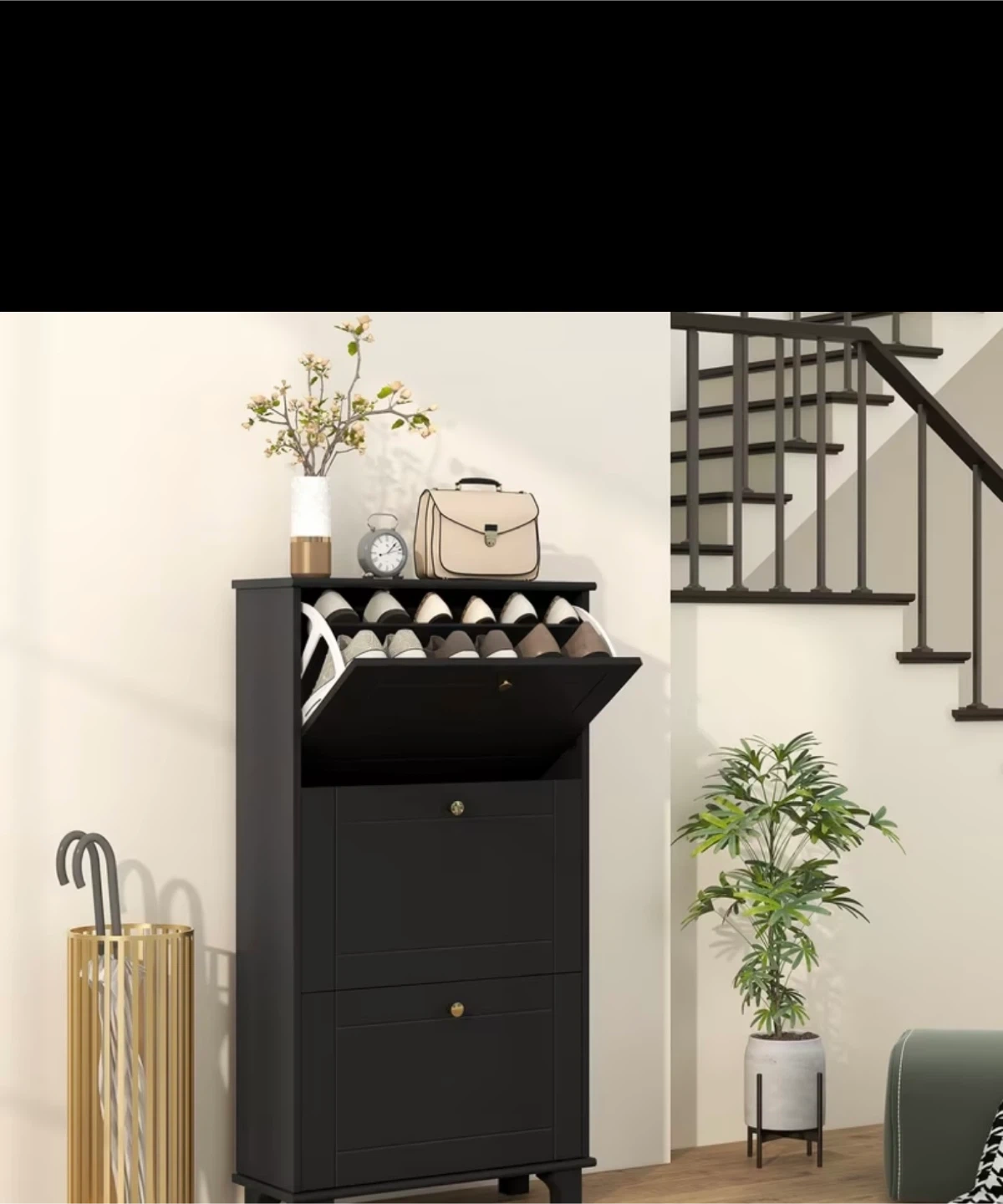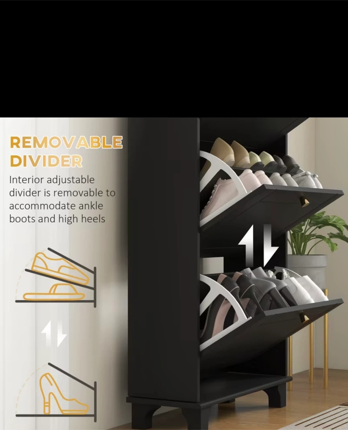 This black shoe cabinet is perfect for keeping your entryway tidy! It features adjustable shelves to accommodate different shoe sizes and types, even ankle boots and high heels. The interior adjustable divider is removable for extra flexibility.