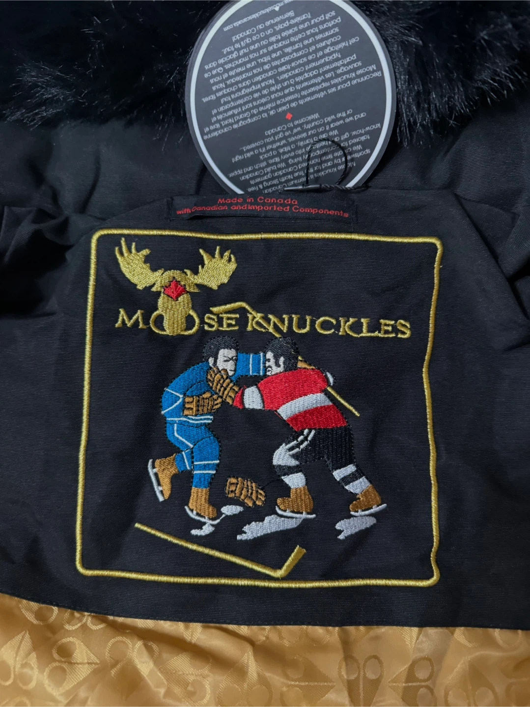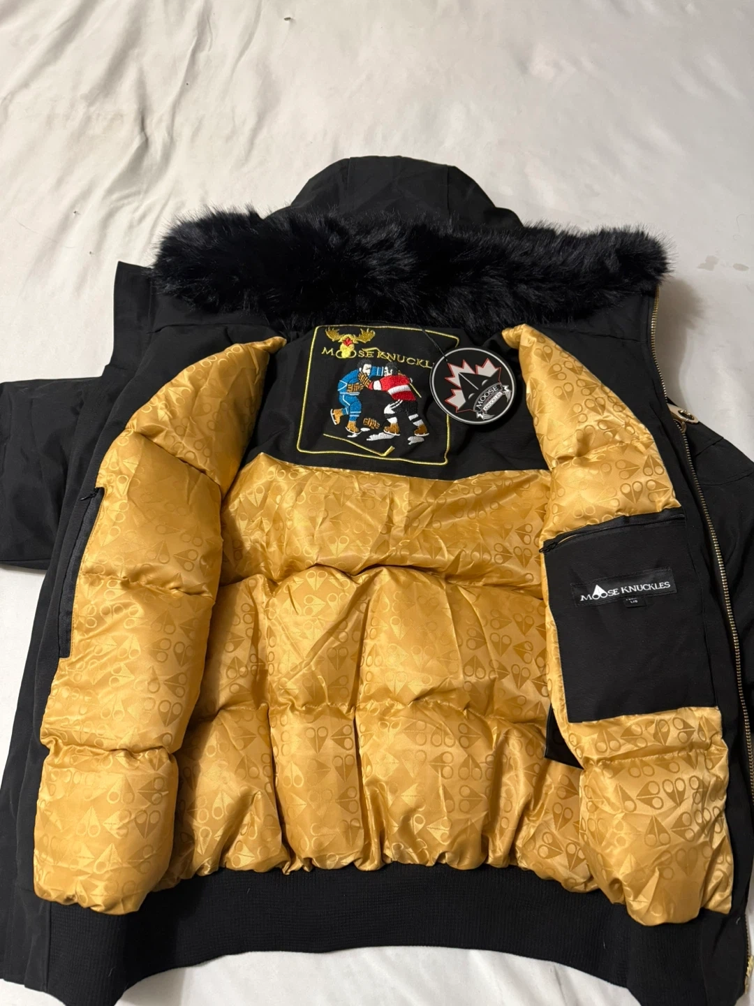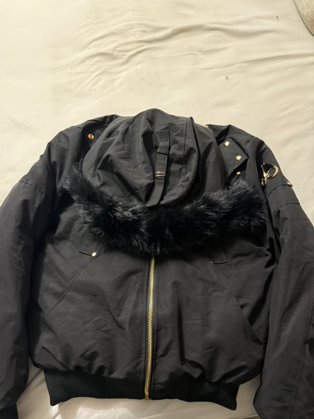 Selling a Moose Knuckles bomber jacket in size L. It's a stylish and warm jacket for the Canadian winter. The jacket features a fur-trimmed hood and the iconic Moose Knuckles logo on the sleeve. Great for keeping warm and looking good!