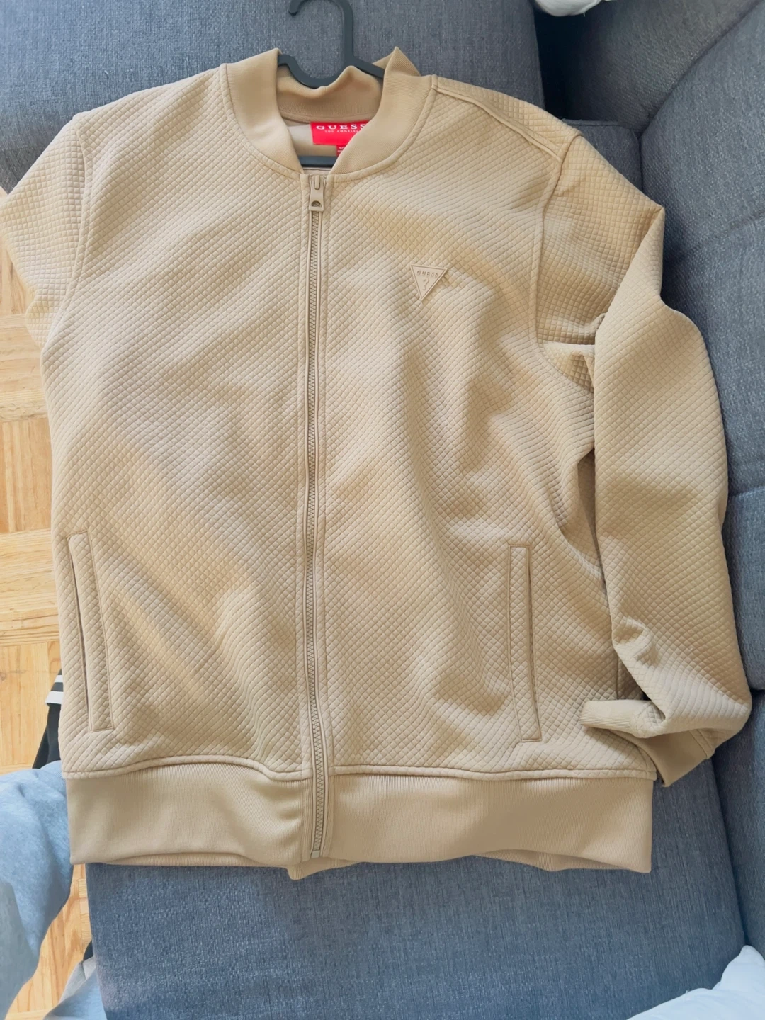 Here's a Guess quilted bomber jacket in size XL. The jacket is a nice neutral beige colour and has a subtle quilted pattern throughout. It's a great layering piece for cooler days!
