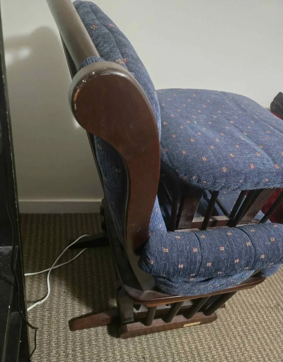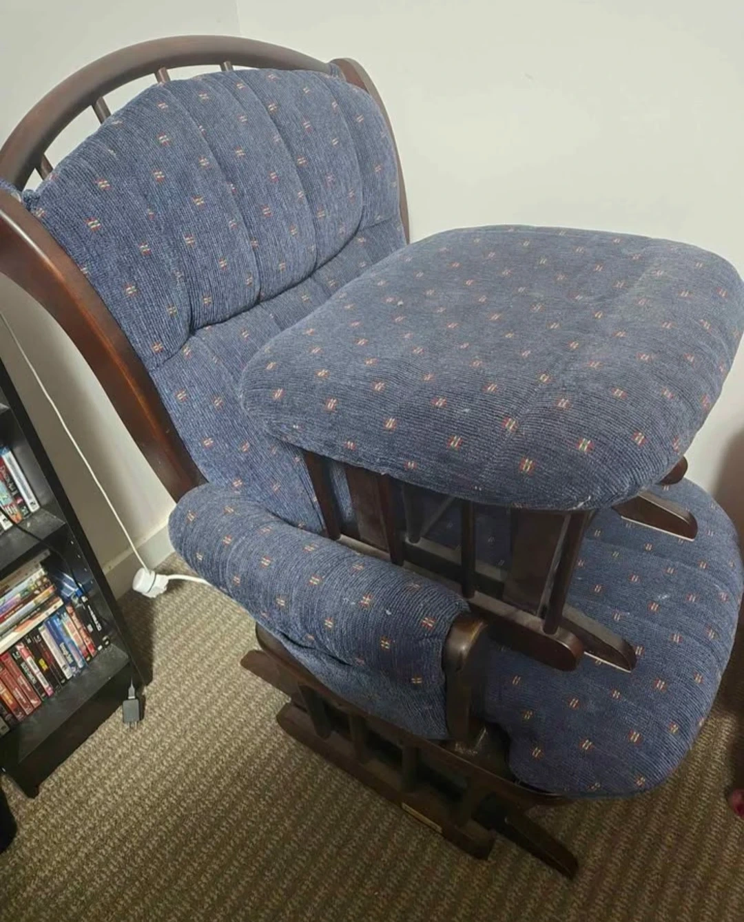 Beautiful solid wood rocker & glider with matching ottoman in excellent, like-new condition. Smooth, quiet gliding motion and very comfortable—perfect for a nursery, breastfeeding/rocking baby, or cozy reading corner.