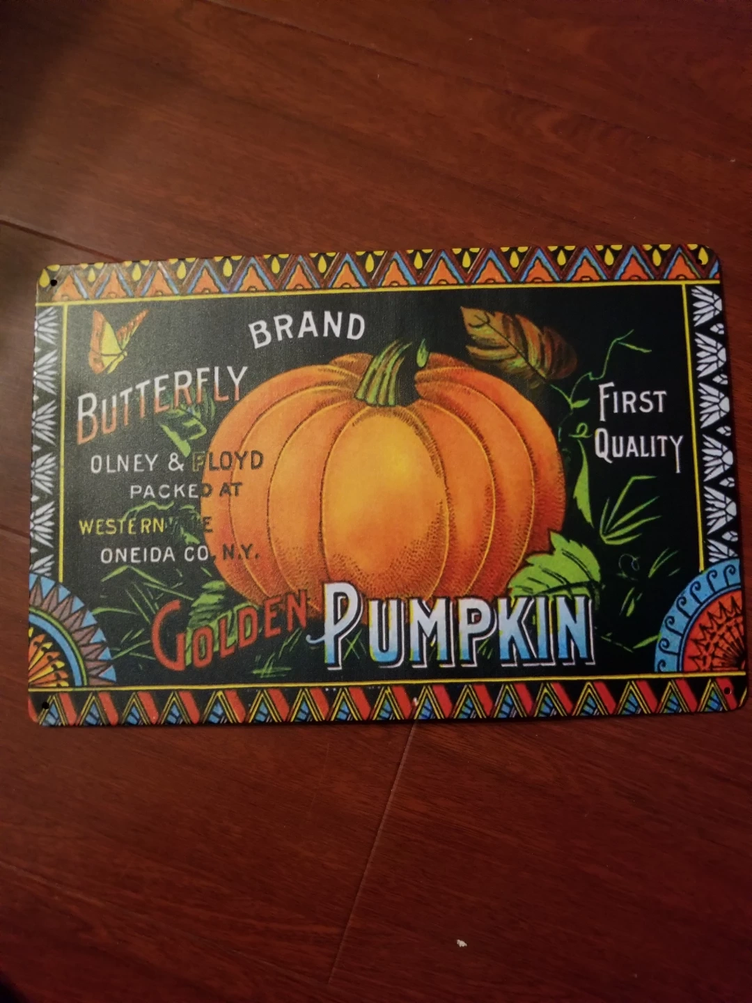 This is a Butterfly Brand "Golden Pumpkin" metal sign. It features a vibrant pumpkin design and is labelled "First Quality". Made by Olney & Floyd, packed at Western, Oneida Co, NY. Brand new 8x12