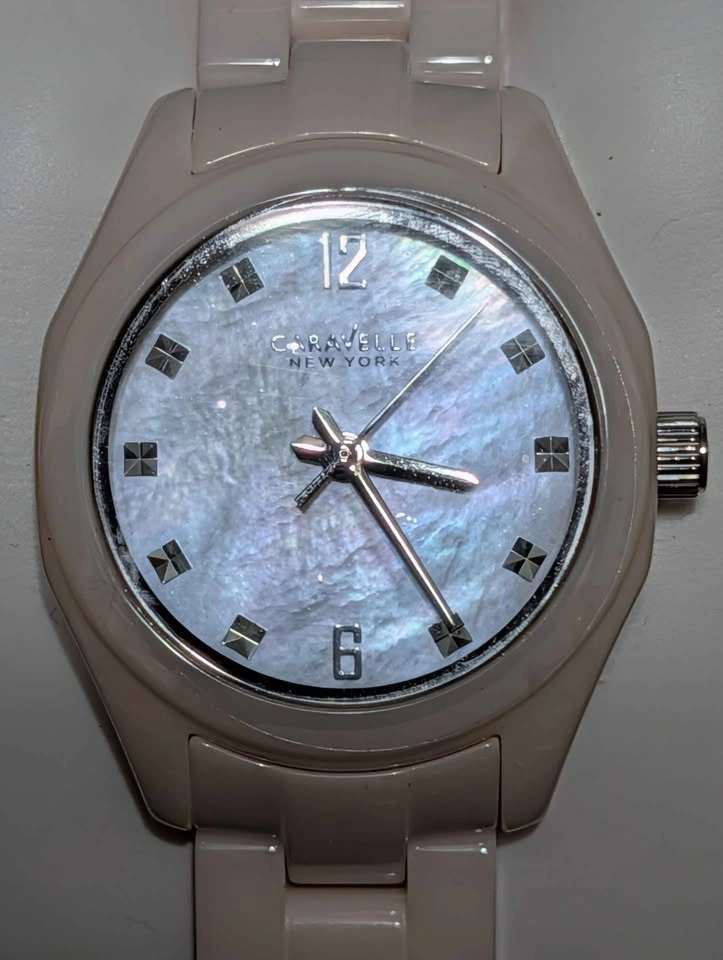 Dial: Shimmering Mother of Pearl face with silver-tone hands and crystal accents
