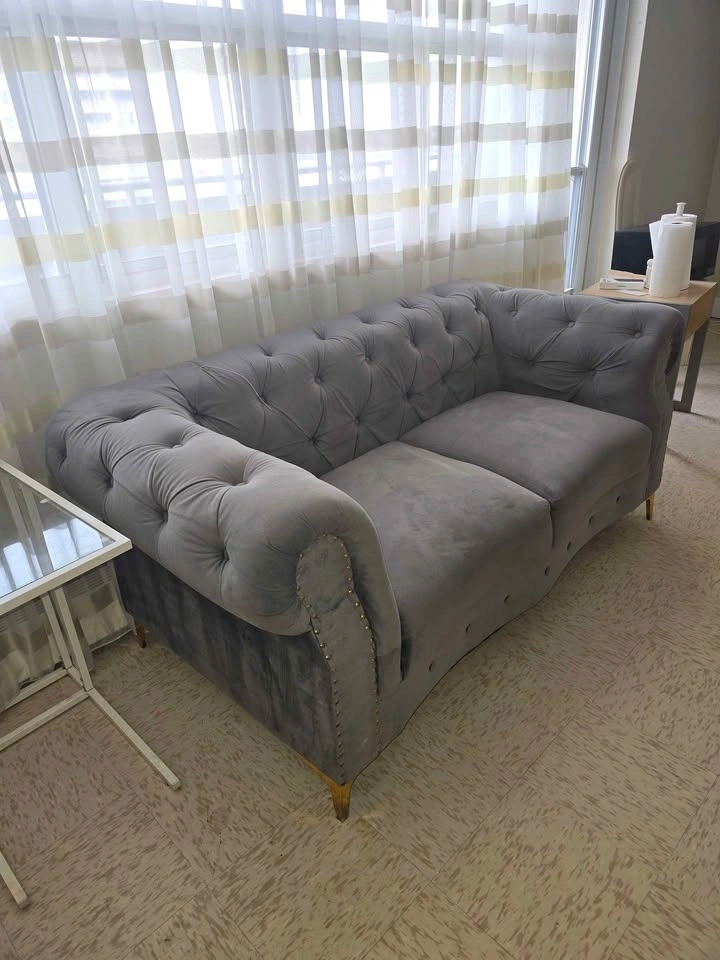 For sale: 3-seat sofa and loveseat. The loveseat is in good condition (see photos). The sofa has a noticeable bleach stain that has discolored the fabric. Interested buyers can purchase one or both items.