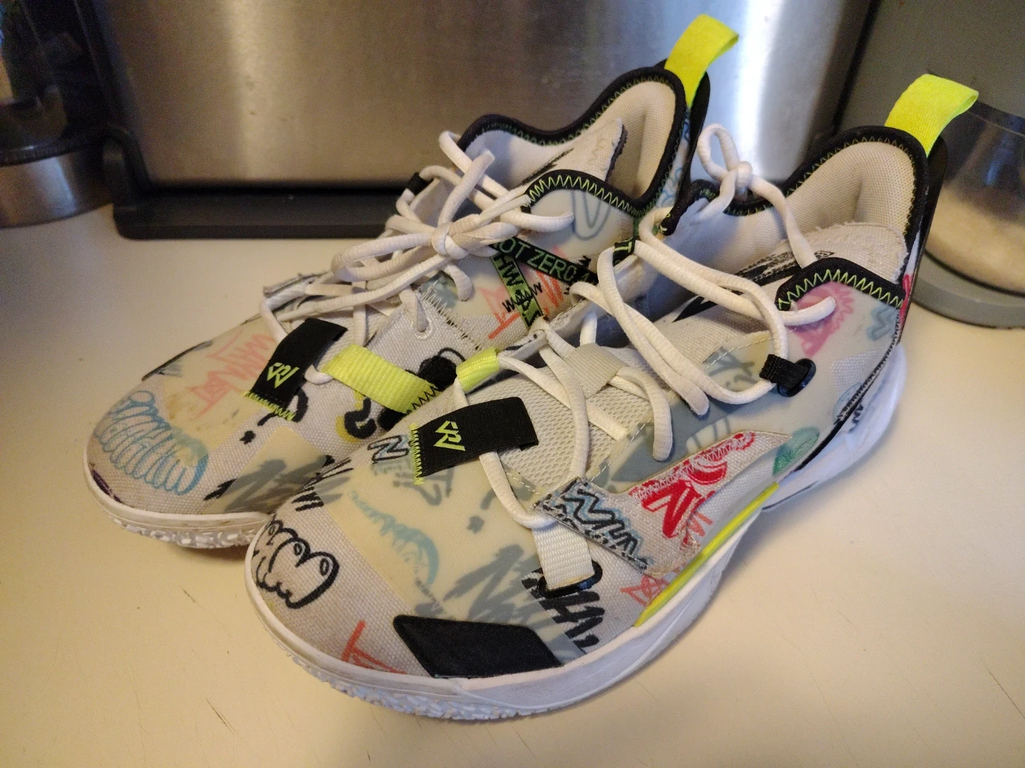 Selling a pair of Nike John Wall Zero basketball shoes with a unique graffiti design! These sneakers are in good condition and ready for the court or casual wear. They feature a white base with colorful graffiti accents, adding a pop of style to your look