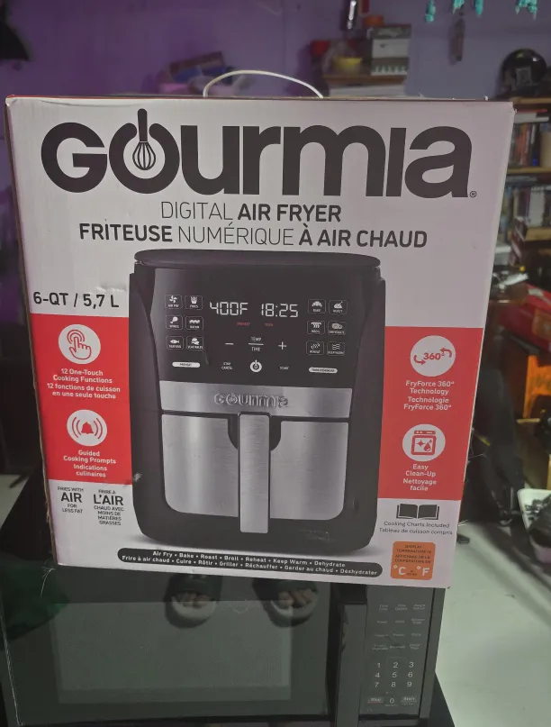 Selling a Gourmia Digital Air Fryer in excellent condition! This 6-QT air fryer makes cooking easy with its 12 one-touch cooking functions. It features FryForce 360° technology for even cooking and easy clean-up. Cooking charts are also included!