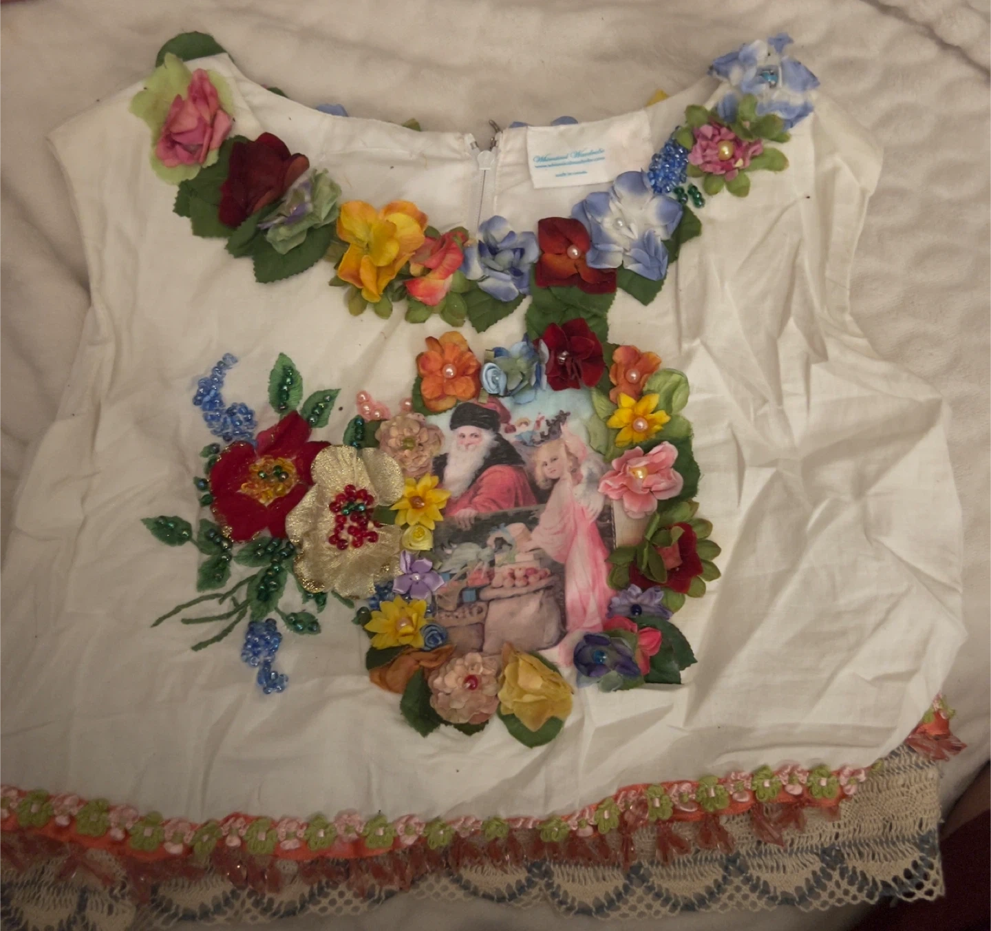 This unique top features beautiful handmade floral embellishments and a charming print. It's a one-of-a-kind piece that's sure to add a special touch to your wardrobe. The details include delicate lace and colourful accents, making it a truly eye-catching item