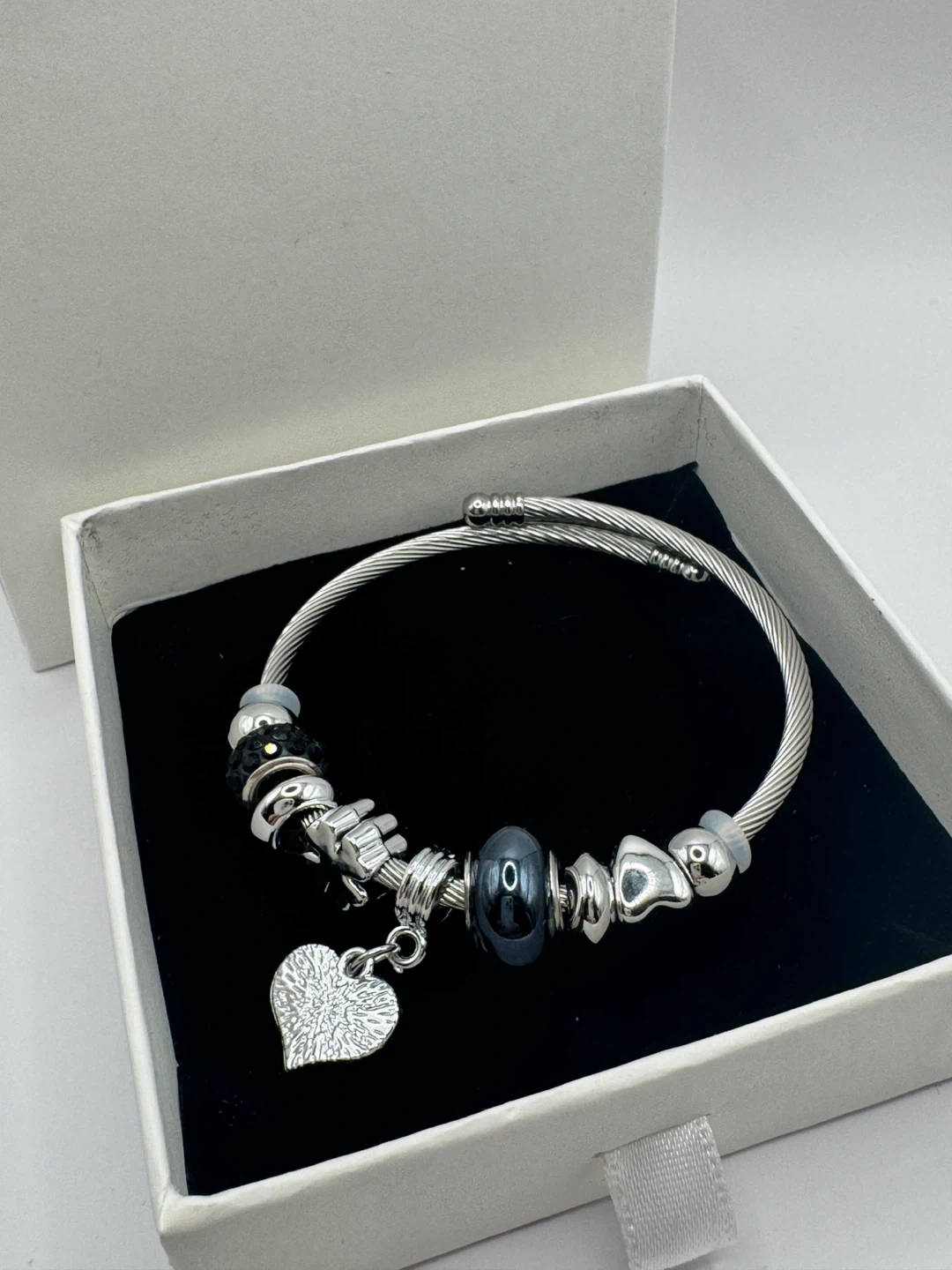Here's a lovely silver charm bracelet, complete with a heart pendant and various decorative beads! It comes in its original box, ready to wear or gift to someone special