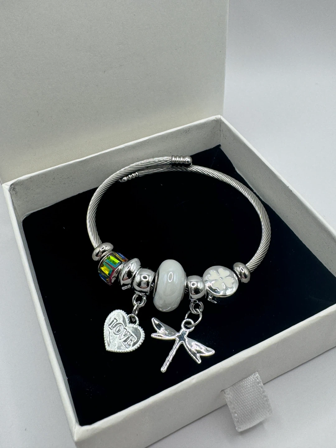 Selling a lovely charm bracelet! It features a silver-tone twisted cable bracelet with various charms, including a dragonfly and a heart that says "LOVE". Comes in a box, perfect for gifting or keeping it safe!
