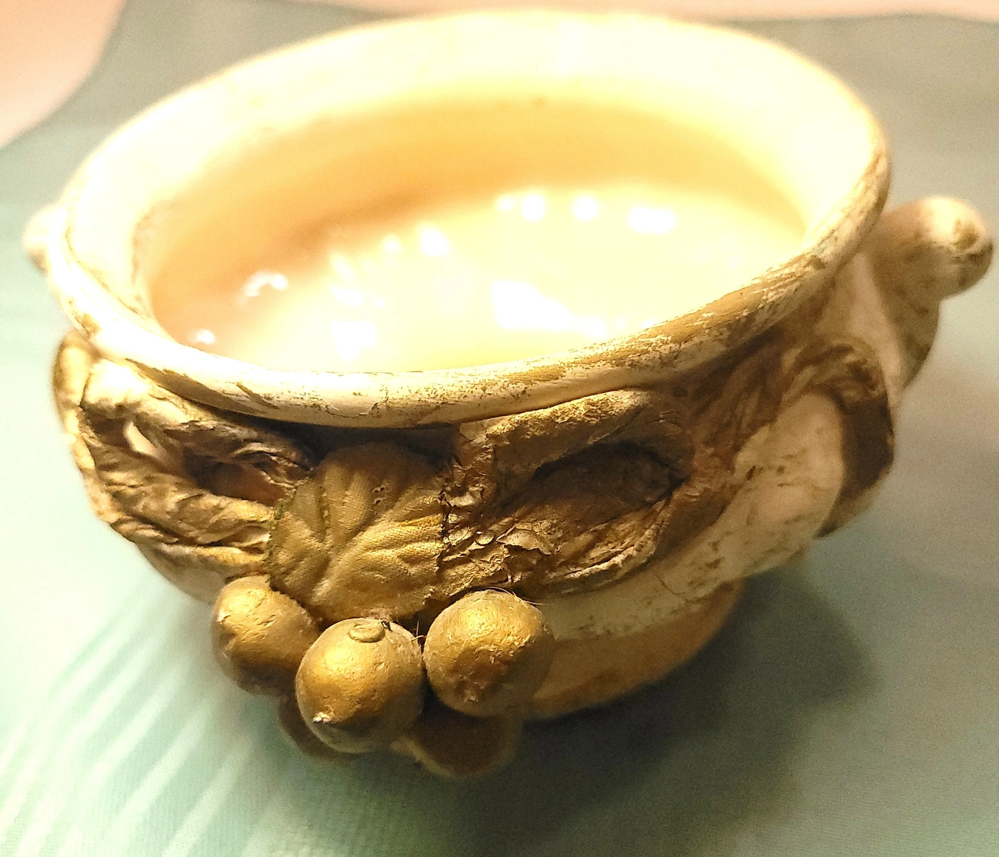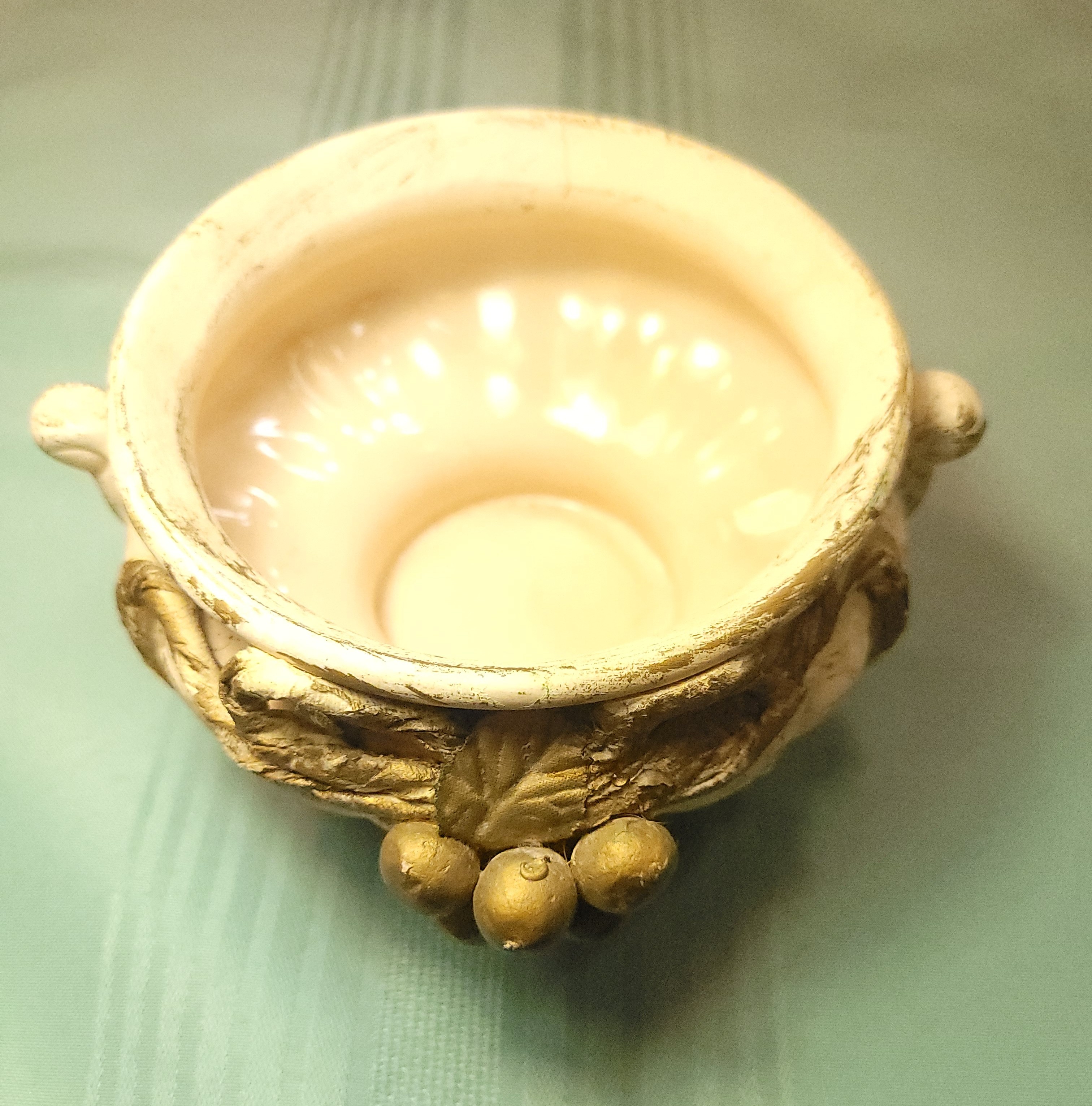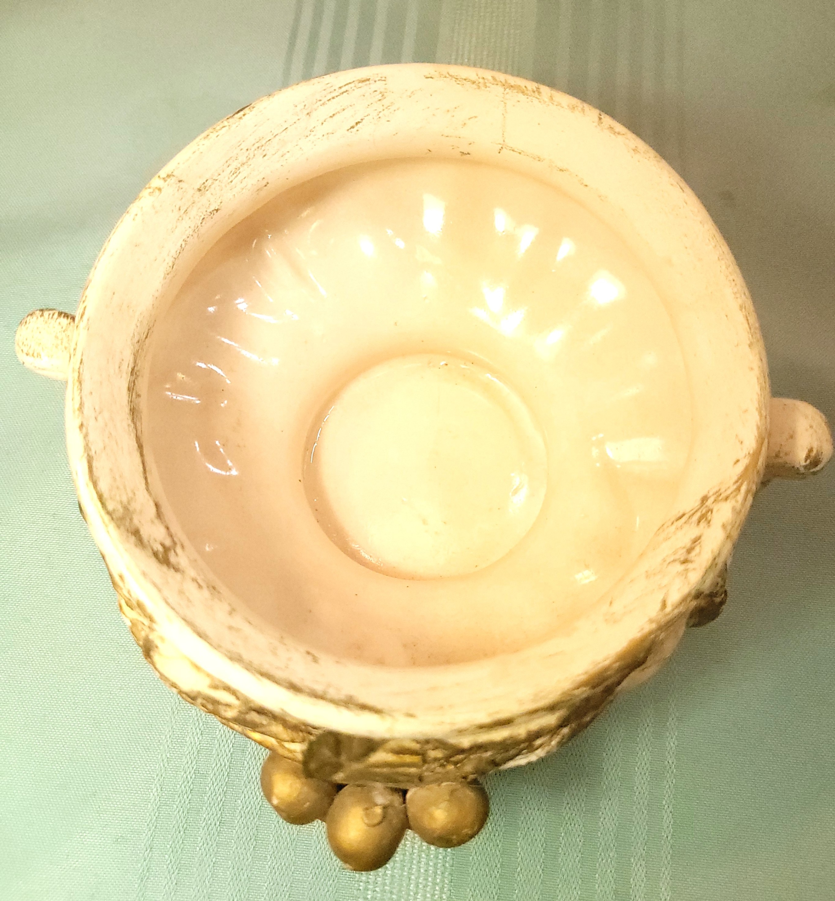 Condition: This item is in good vintage condition light wear. The gold gilding shows light, attractive "distressed" wear consistent with its age and style, which enhances its vintage appeal. The interior is clean with no mineral staining. Please review all photos for a detailed look at the finish.