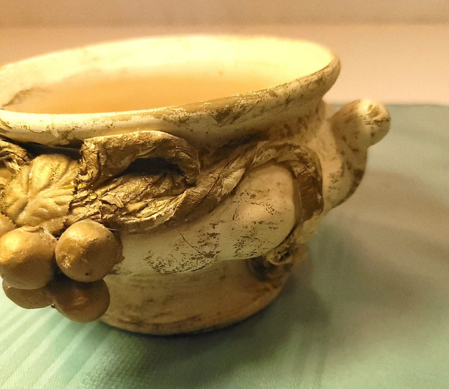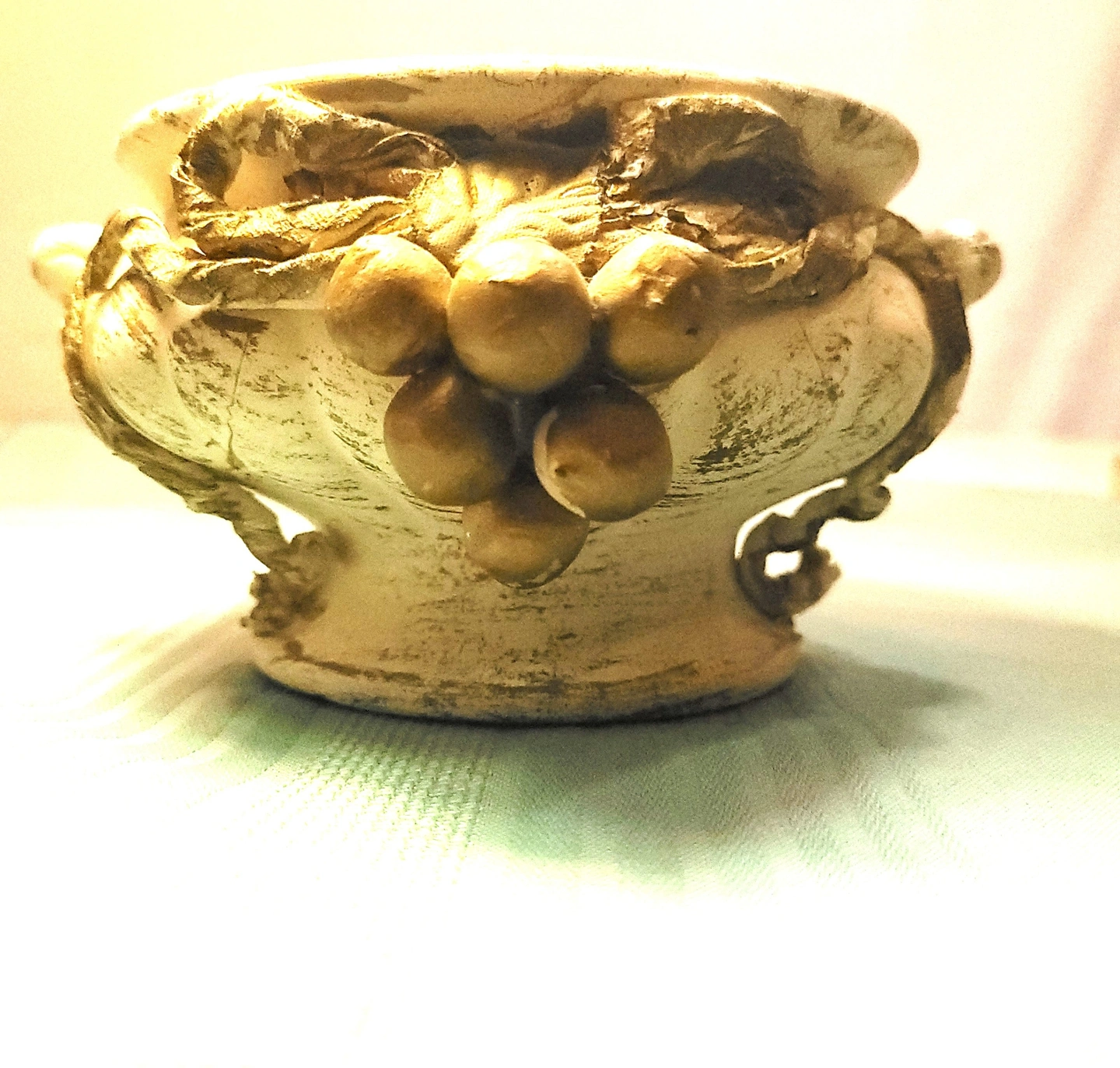 The exterior is decorated with a high-relief (raised) design of lush grape clusters and flowing ribbons. The pedestal base and flared, scalloped rim give it a sophisticated silhouette that works perfectly as a succulent planter, candy dish, or jewelry catch-all.