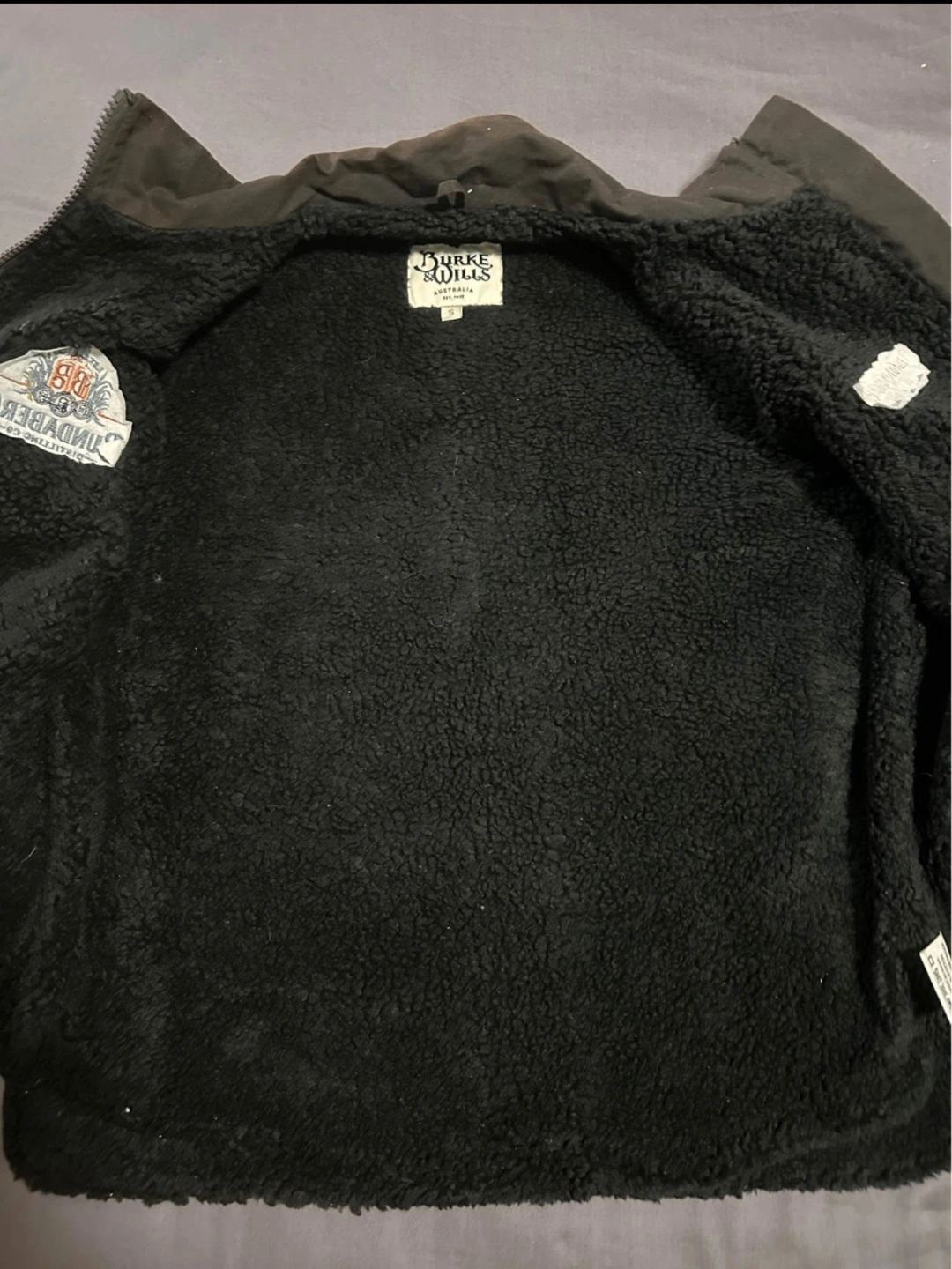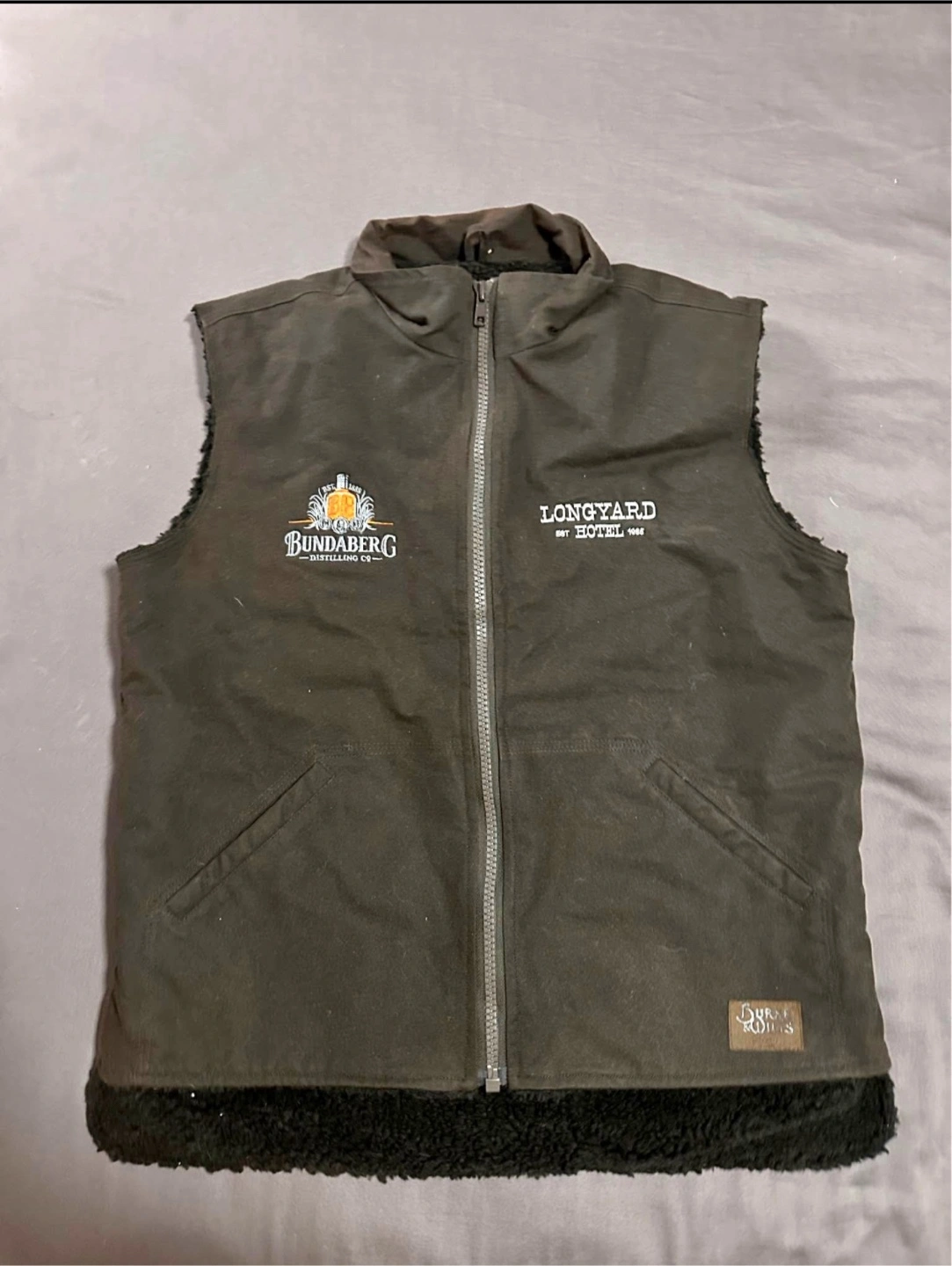Here's a Burke & Wills Sherpa lined vest. Size S but fits a slim Medium also. It's a stylish and comfortable vest featuring the Bundaberg Distilling Co. logo and Longyard Hotel EST 1888. Made from 100% cotton, it's also waterproof!