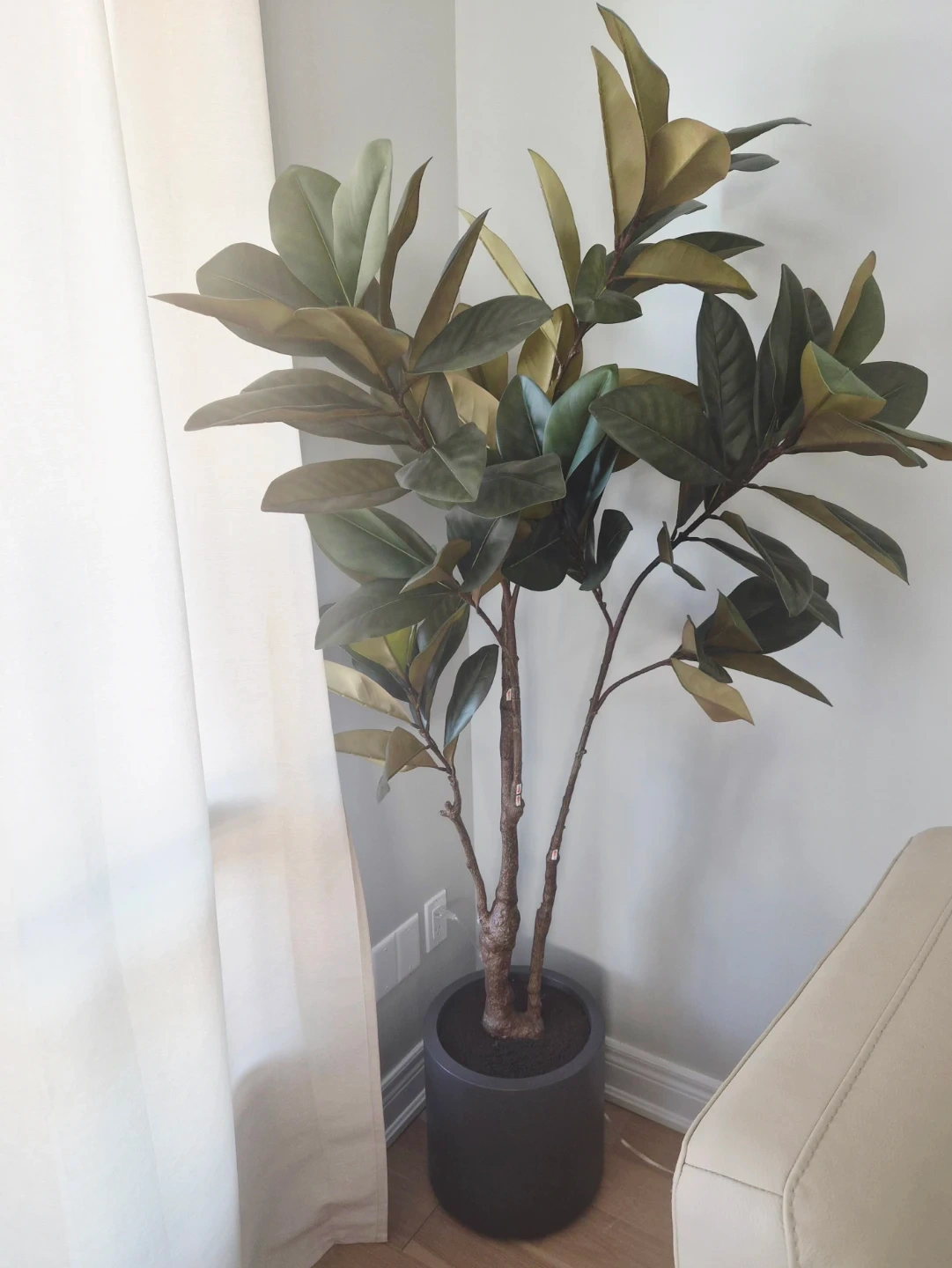 Selling a faux magnolia tree in a pot! It's in great condition and would look lovely in any room. The leaves are a mix of green and brown, giving it a realistic look. Perfect for adding a touch of nature without the upkeep
