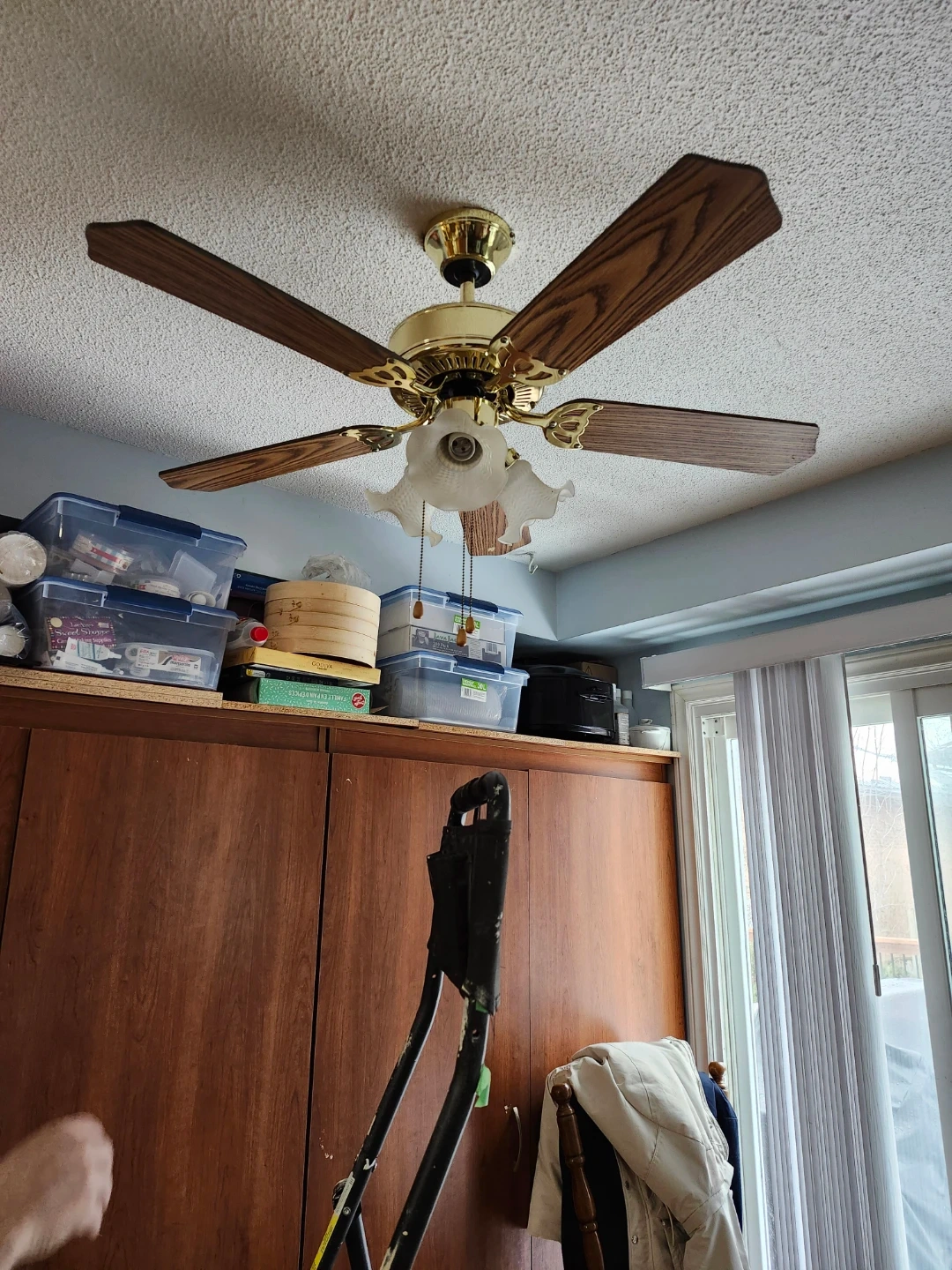 Selling a ceiling fan with a built-in light fixture. It features wooden blades and a gold-tone base. The light fixture has a decorative shade. Perfect for adding a touch of elegance to any room. PLEASE, text only. 9056225663
