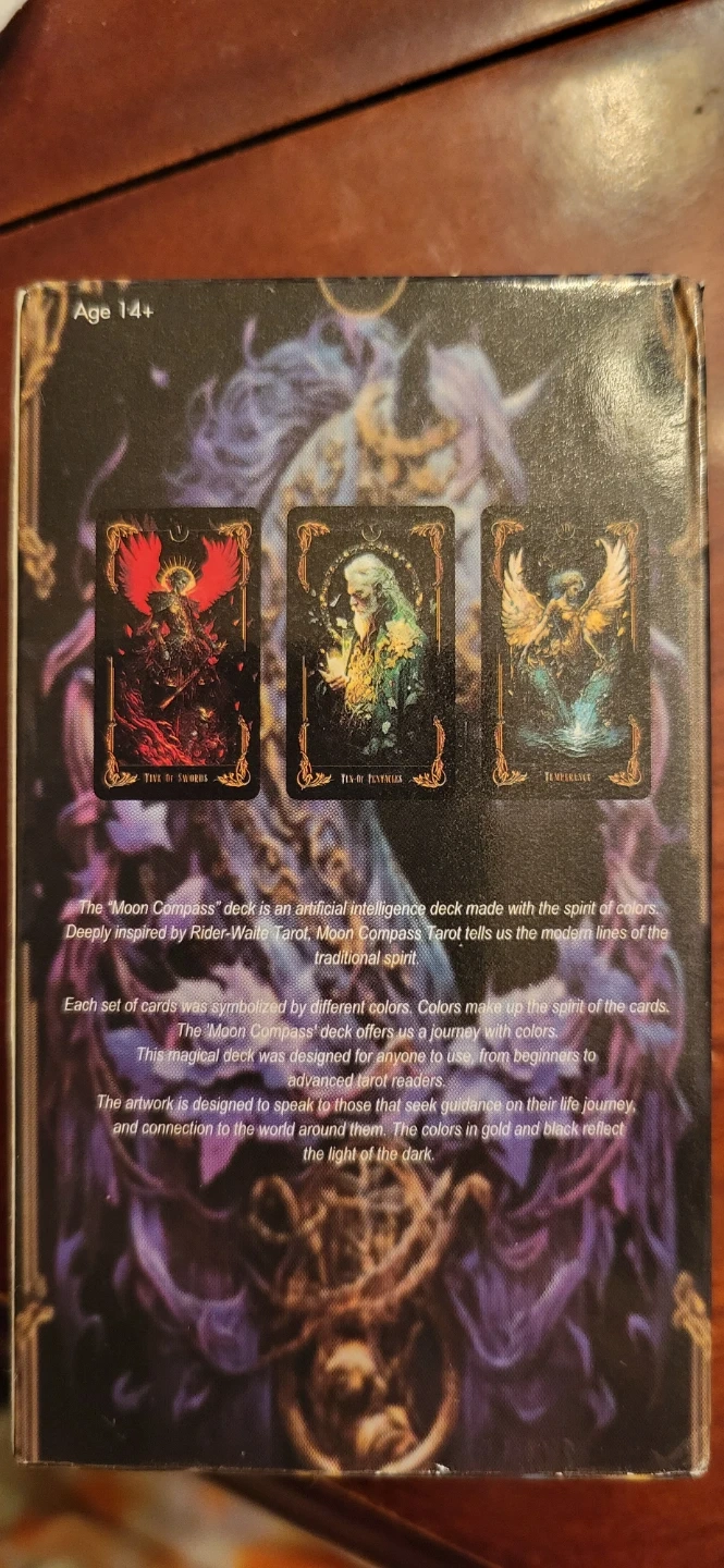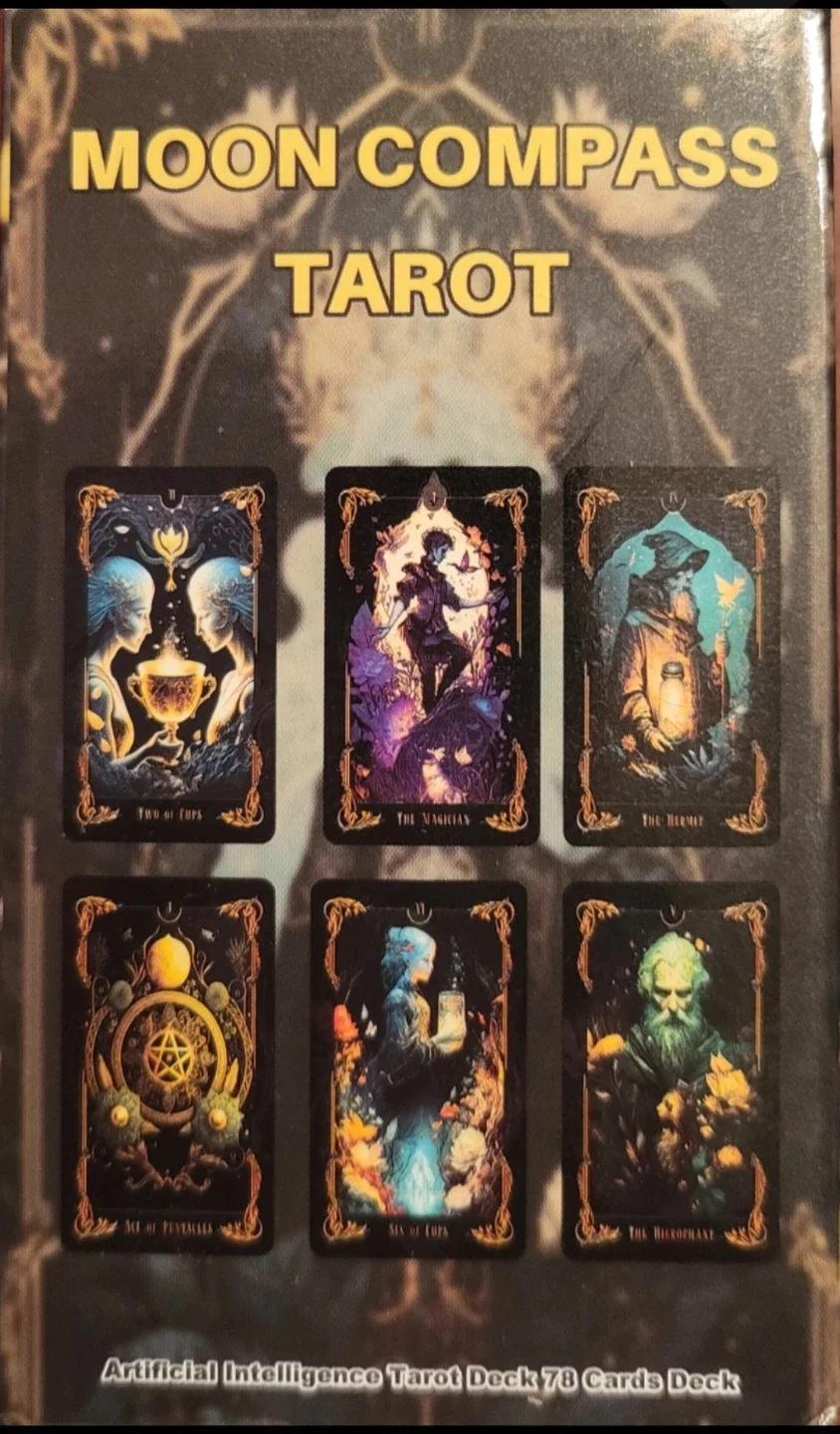Selling a Moon Compass Tarot deck. This is an artificial intelligence deck made with the spirit of colours. The deck offers a journey with colours, and is designed for anyone to use, from beginners to advanced readers. It contains 78 cards.