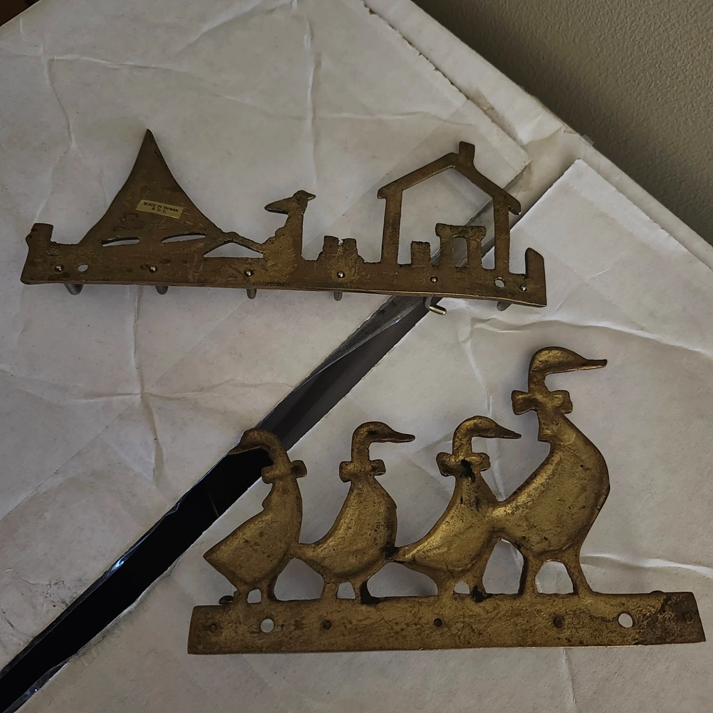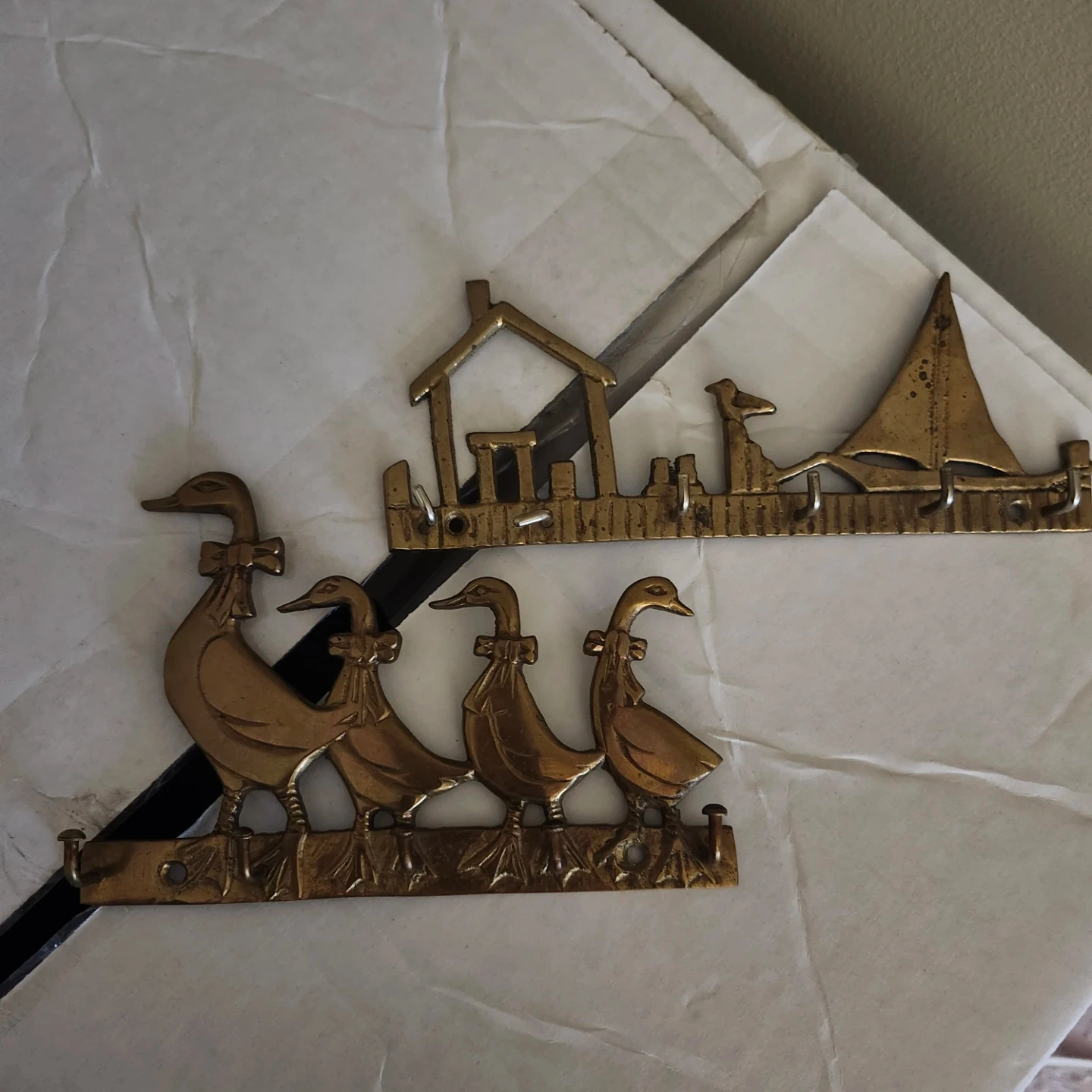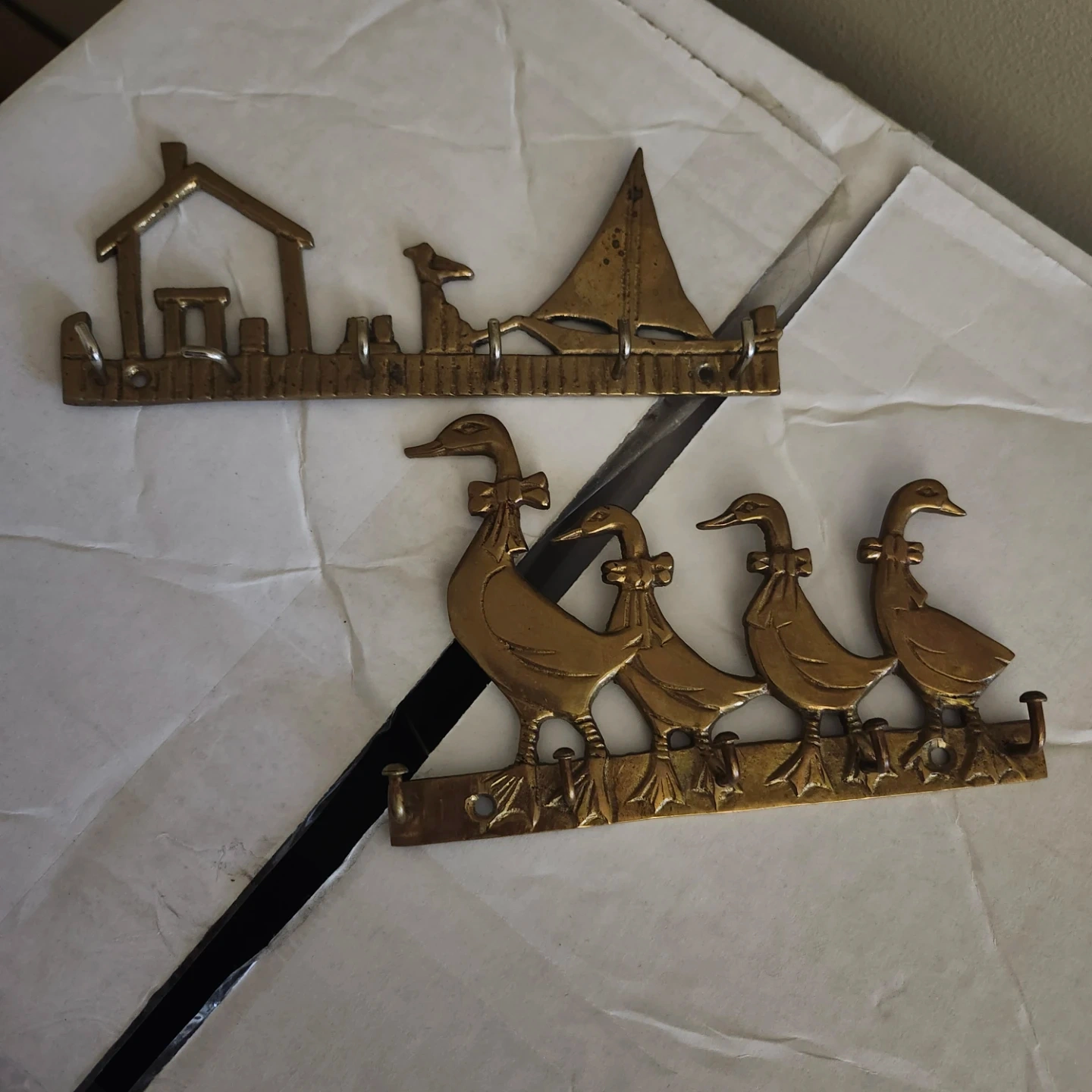 Selling a set of two vintage brass key hooks. One features a charming scene with a sailboat and house, while the other showcases a delightful family of ducks. They're perfect for adding a touch of vintage charm to your home!
