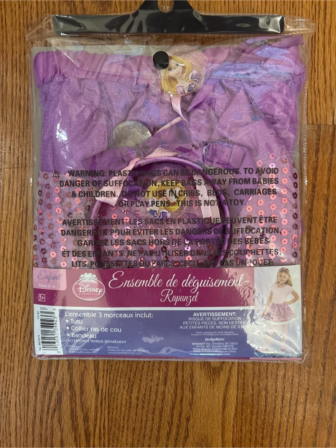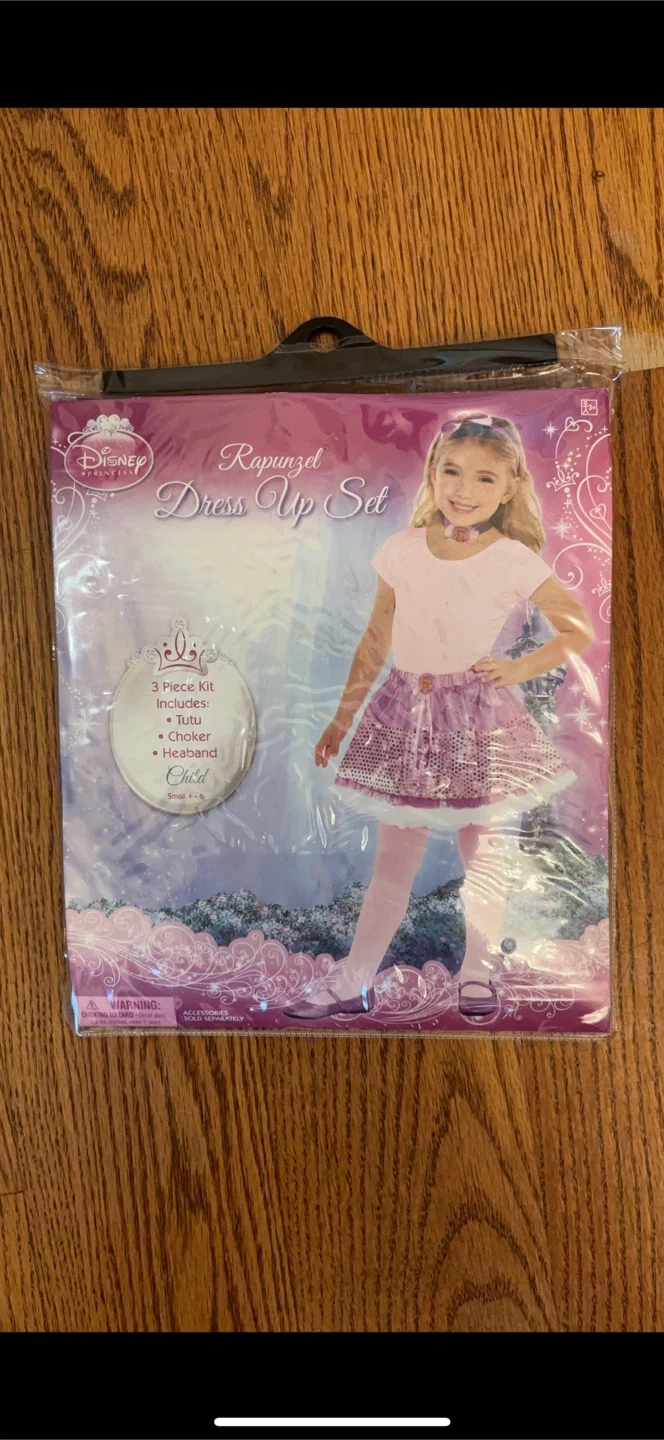 Rapunzel Dress Up Set from Disney! This set is perfect for your little princess. It includes a tutu, choker, and headband. Size is 4-6.