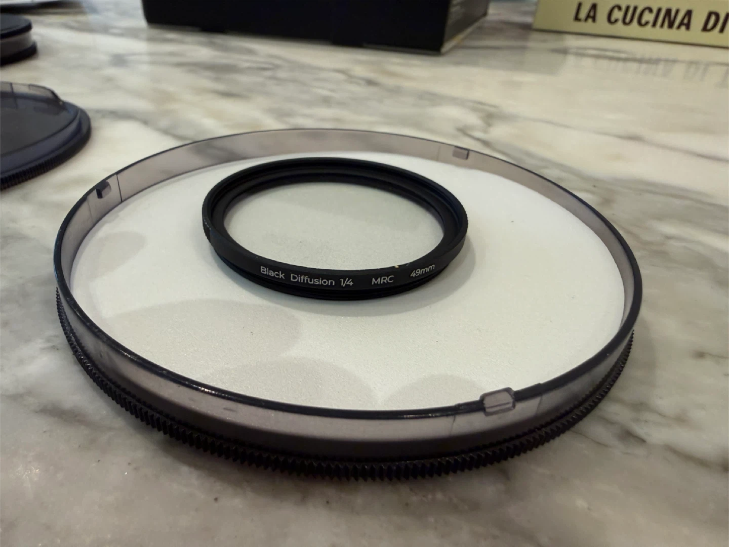 Includes original box, red shutter button, 49mm 1/4 black diffuse filter, additional straps, original battery.