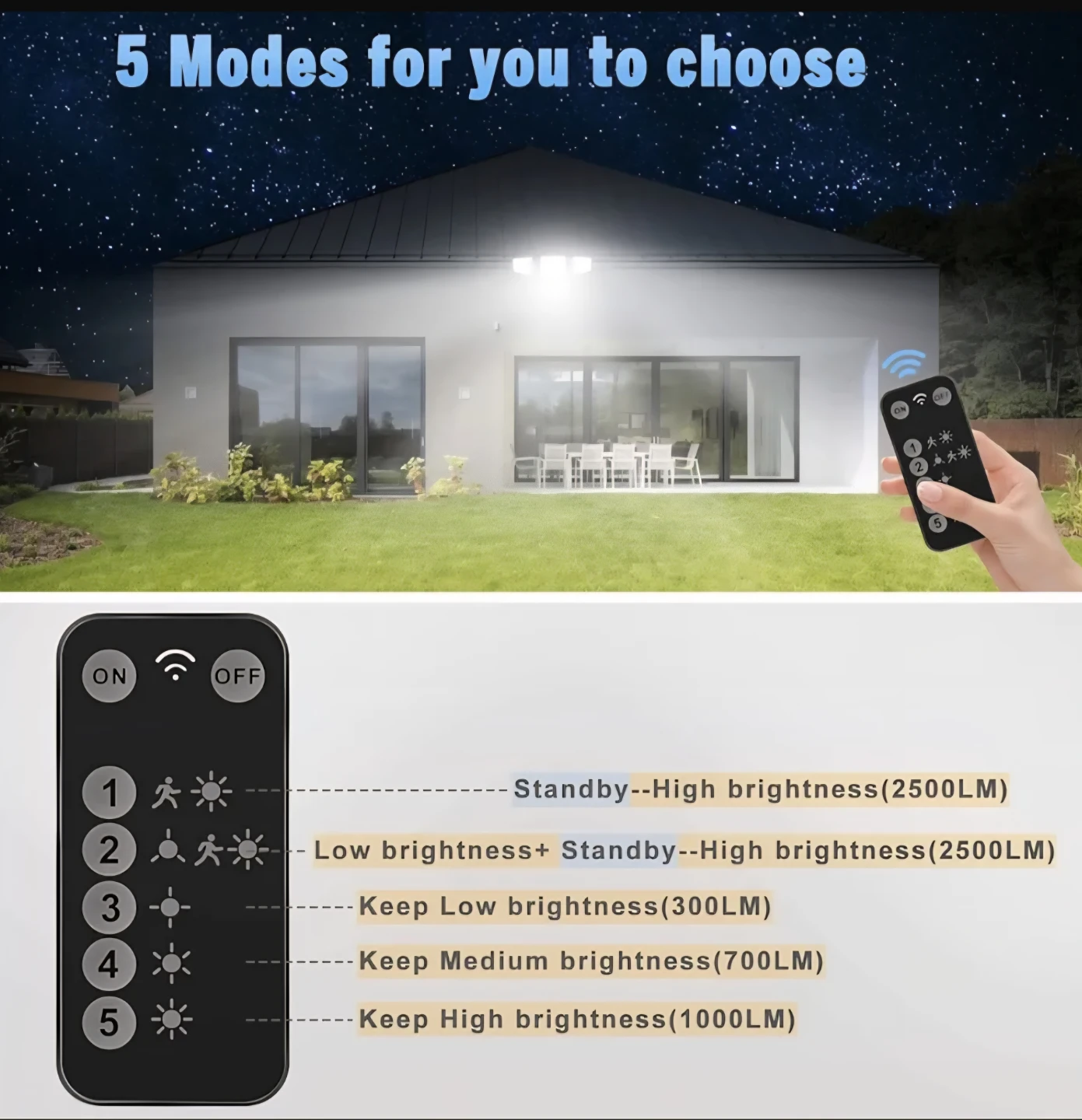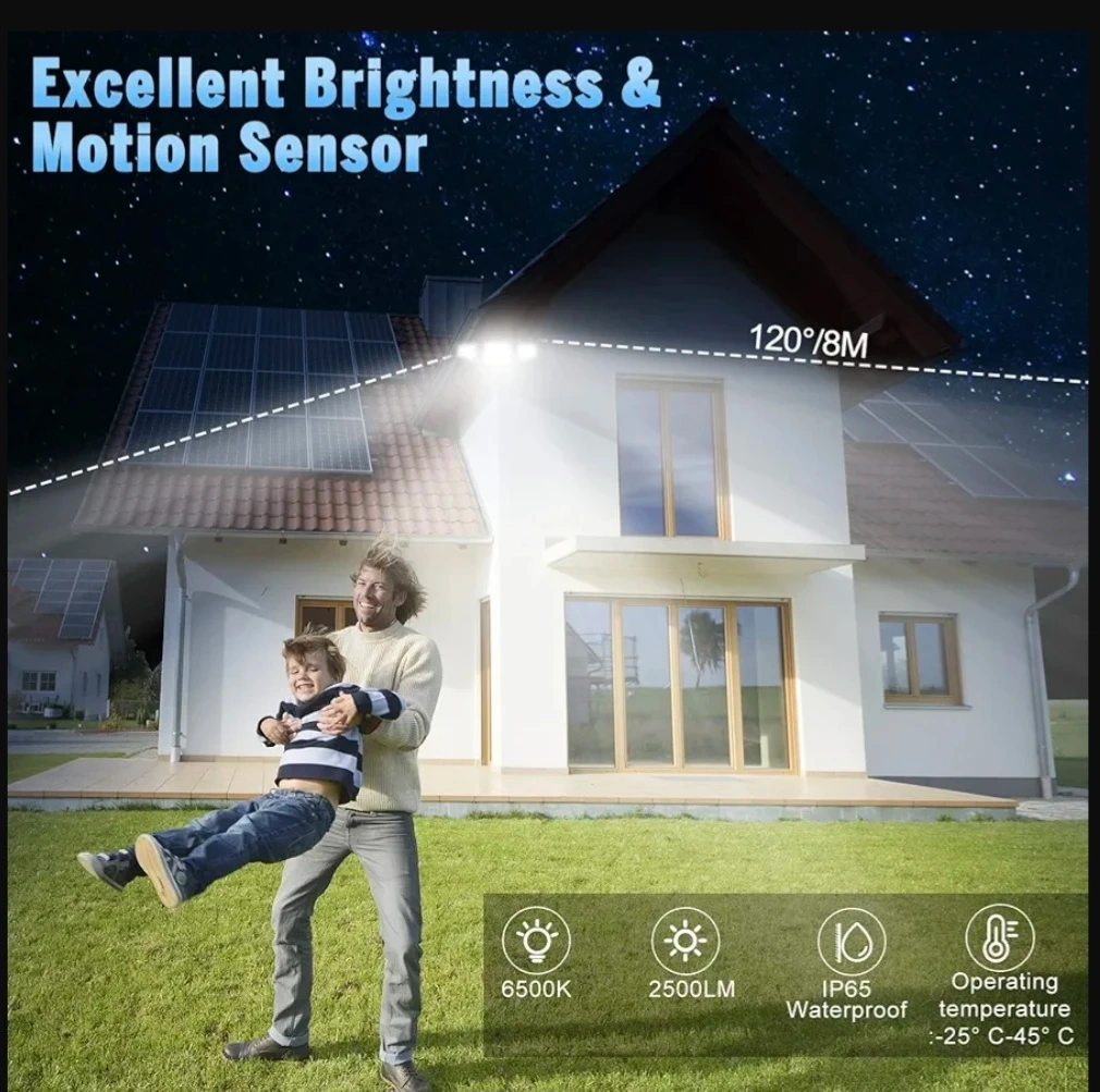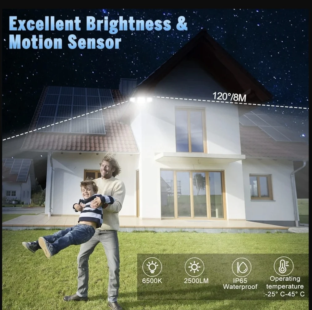 This outdoor flood light features 5 modes for you to choose from, and it comes with a remote control. You can adjust the angle with its flexible rotation design. It has excellent brightness and a motion sensor. It's also waterproof and operates in temperatures from -25°C to 45°C