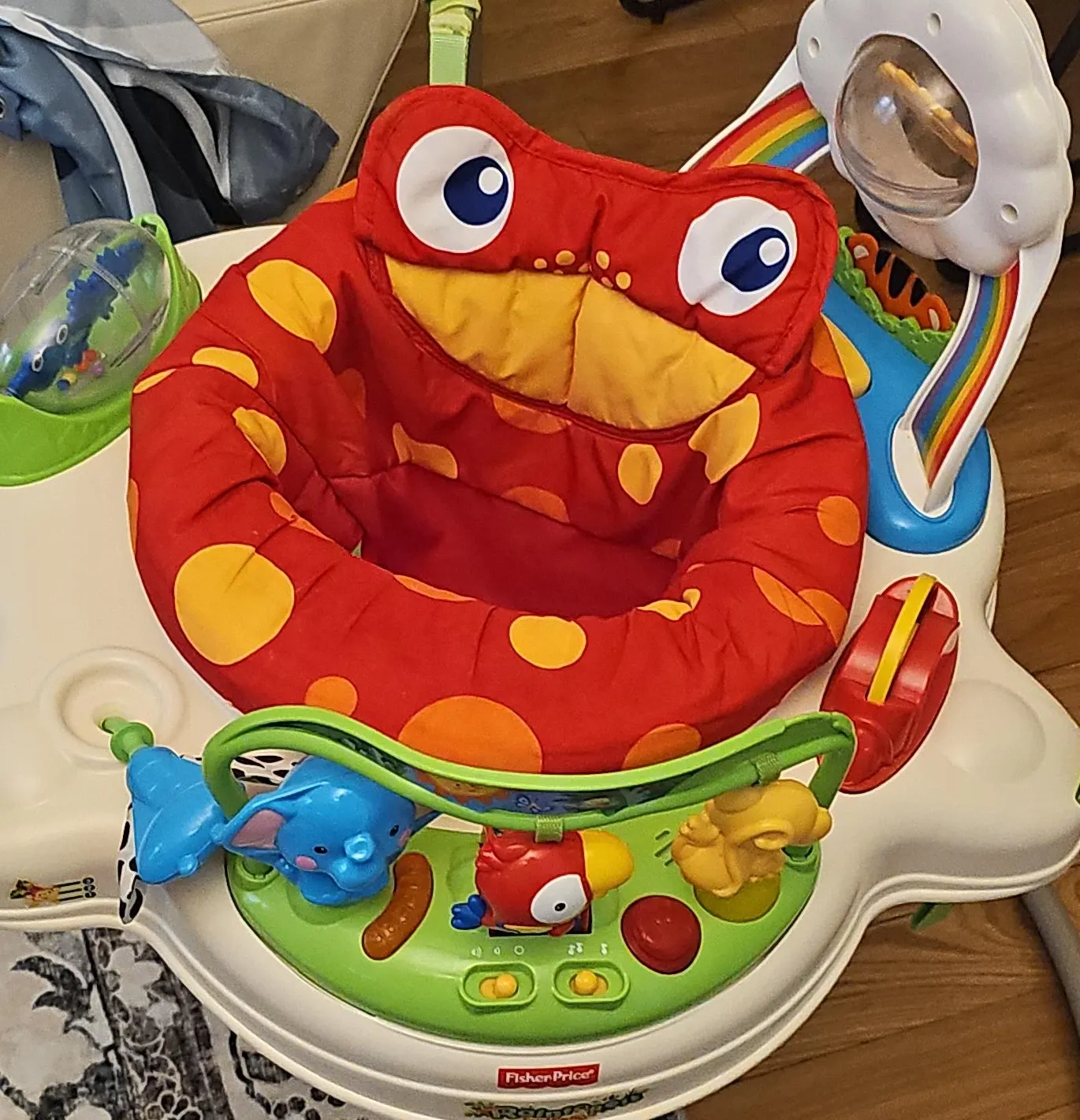 Selling a Fisher-Price baby activity center with a cute frog design! It's in great condition and ready for a new little one. The seat is red with yellow and orange polka dots, and there are lots of colorful toys to keep your baby entertained