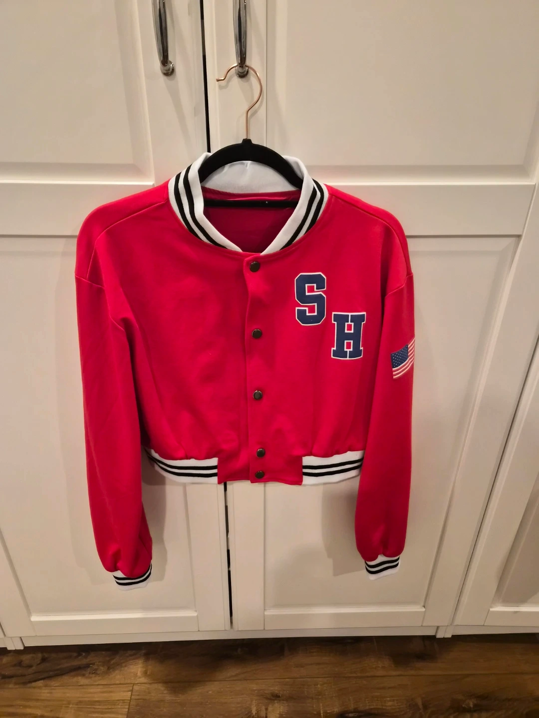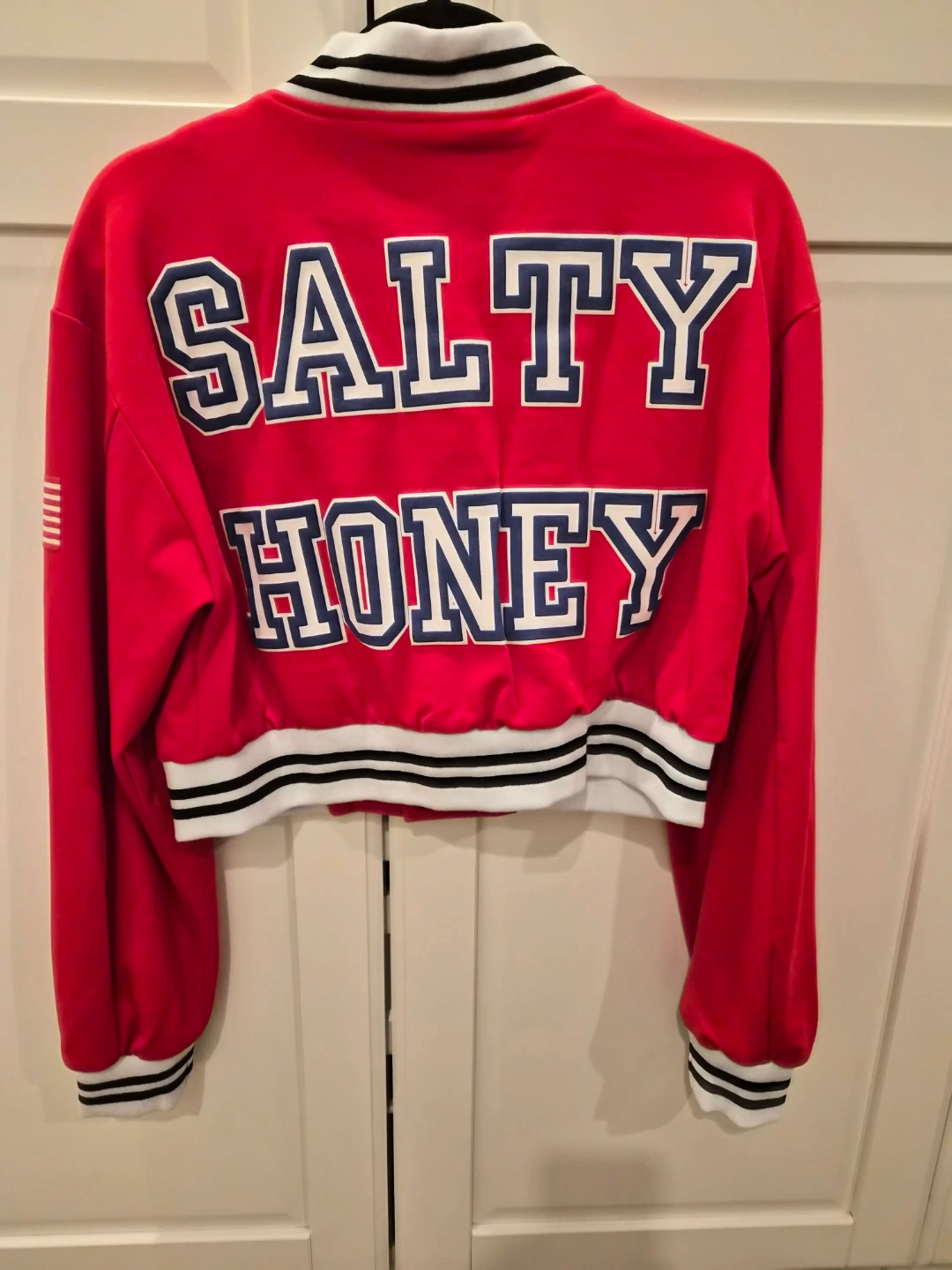 Selling a Salty Honey varsity jacket in red! It's in great condition and ready for a new owner. The jacket is a size medium and made of 70% rayon and 30% spandex. Perfect for adding a pop of colour to your wardrobe! New