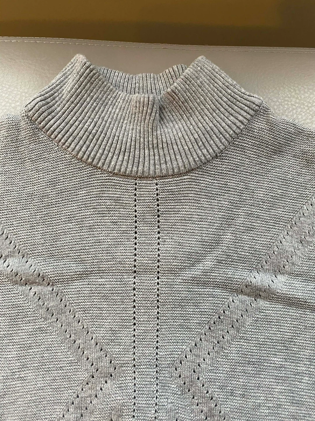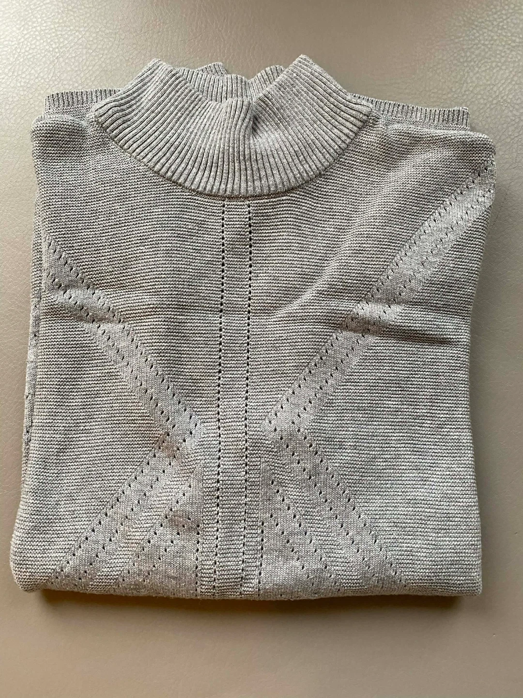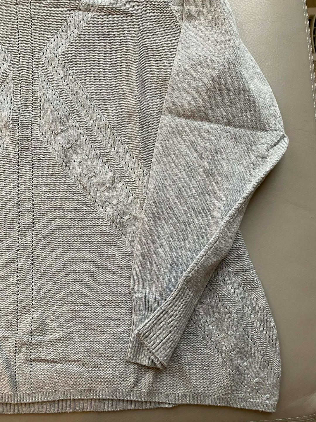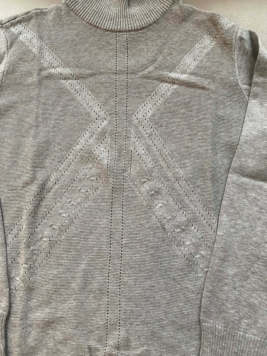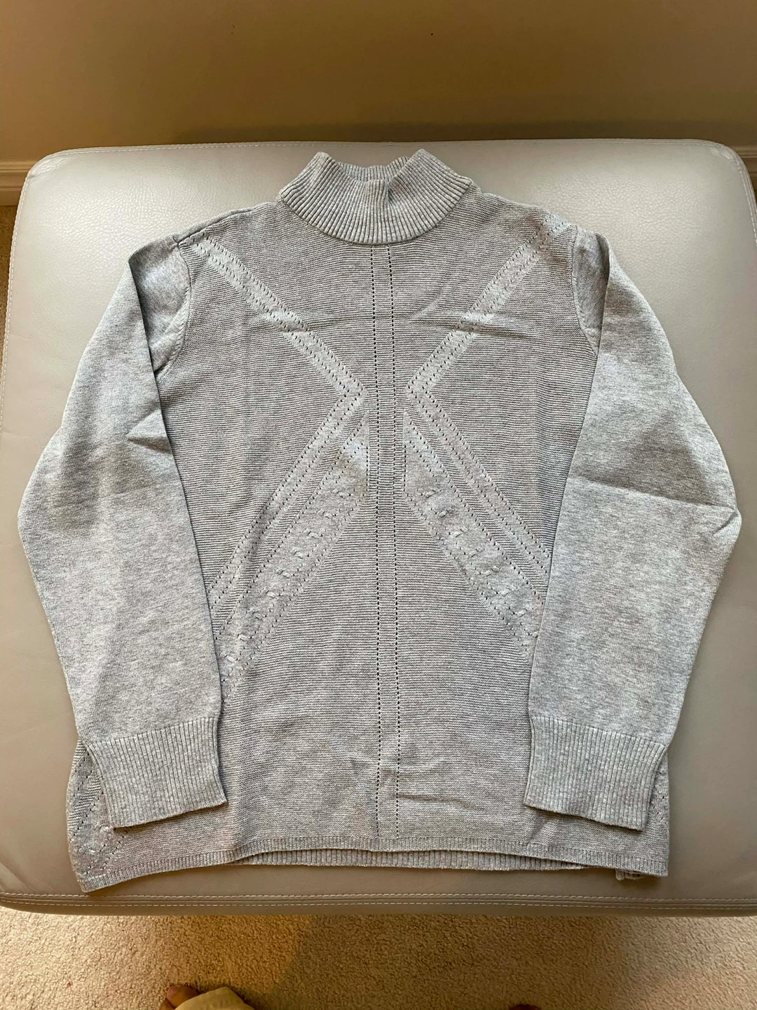 Used it only on Christmas Eve ,A cozy grey knit sweater, perfect for layering or wearing on its own! The knit pattern adds a touch of detail to this classic piece.