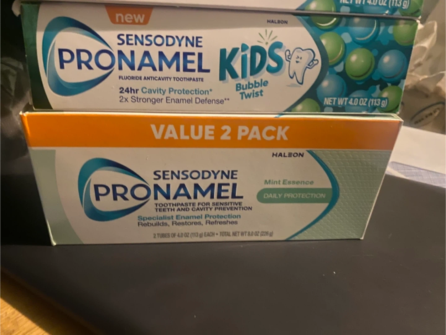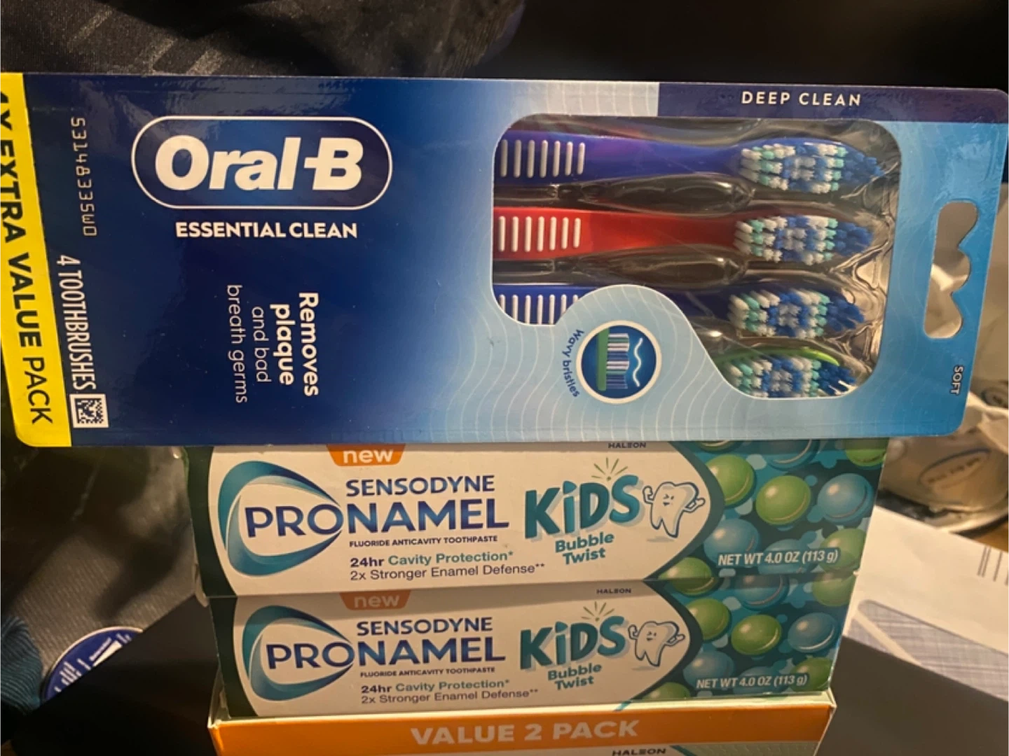 Selling a pack of Oral-B Essential Clean toothbrushes (4 count) and Sensodyne ProNamel toothpaste. The toothpaste includes a 2-pack of Sensodyne ProNamel Kids Bubble Twist and a 2-pack of Sensodyne ProNamel Mint Essence.