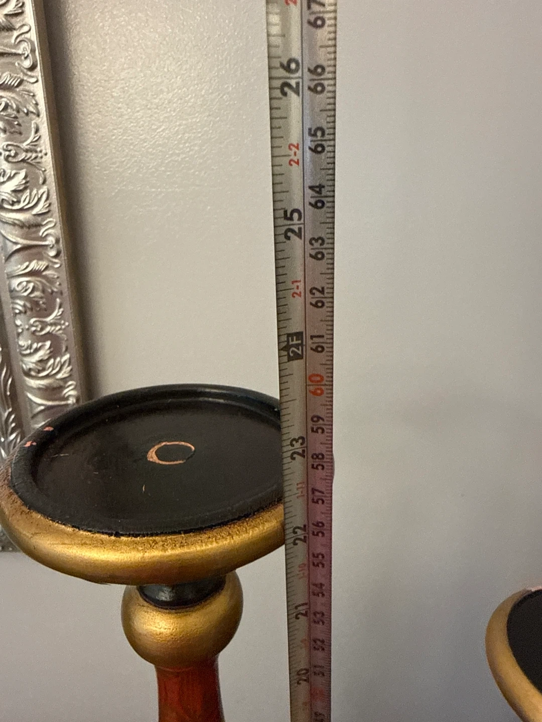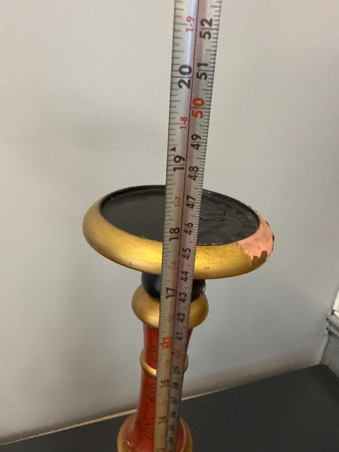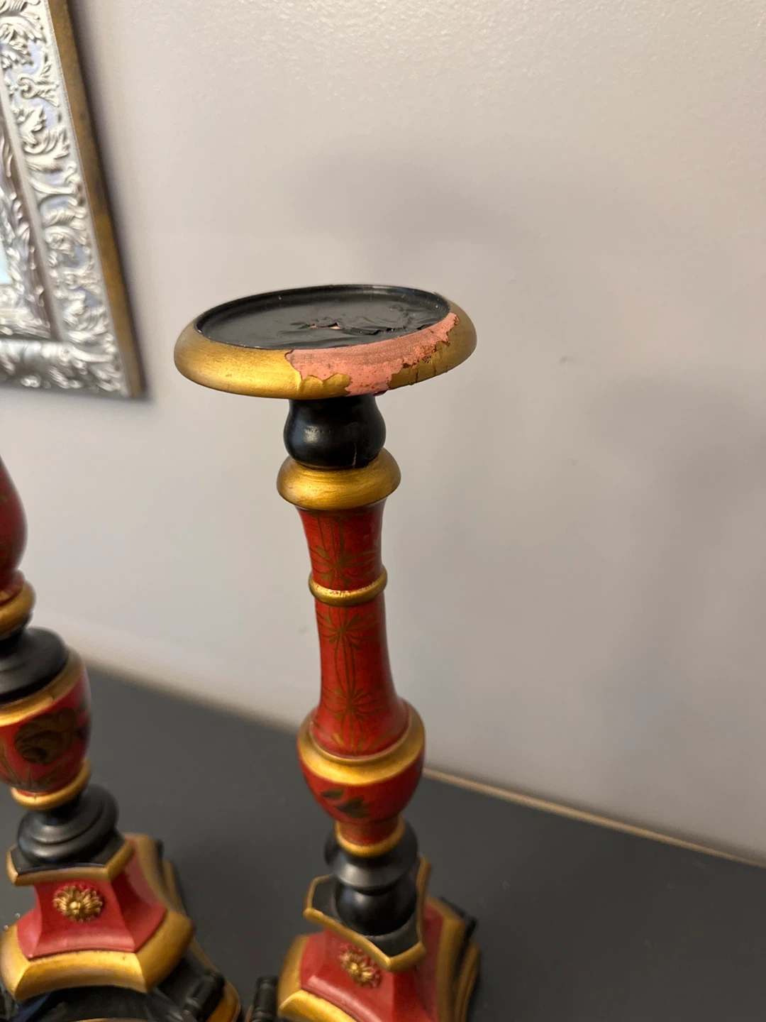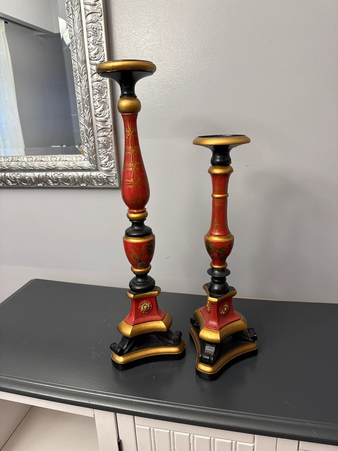 Selling a pair of decorative candle holders. They're red and gold with black accents. One is approximately 23 inches tall, and the other is about 19 inches tall. They add a touch of elegance to any room! One has a little damage as seen on photo.