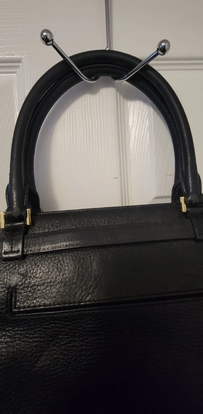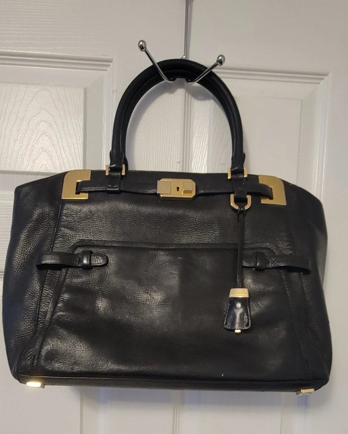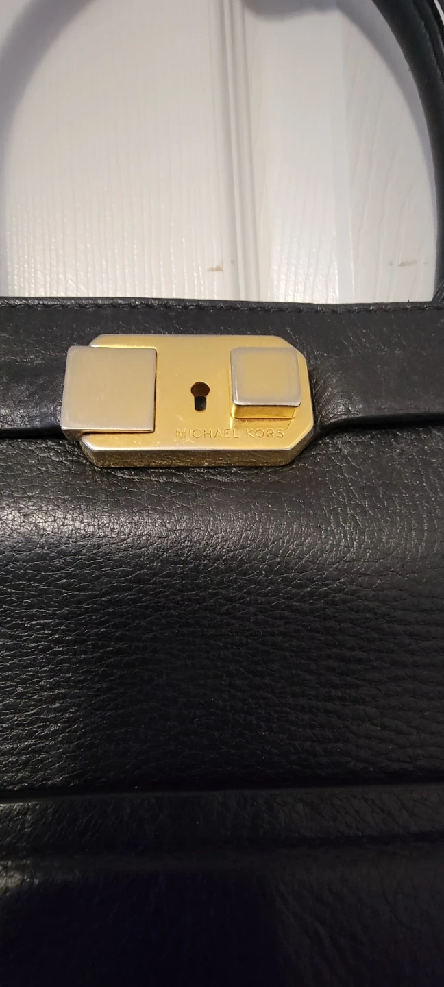 Selling a black leather satchel from Michael Kors. It's in good condition with some wear and tear on the corners, some tarnishing on hardware as shown in the photos.