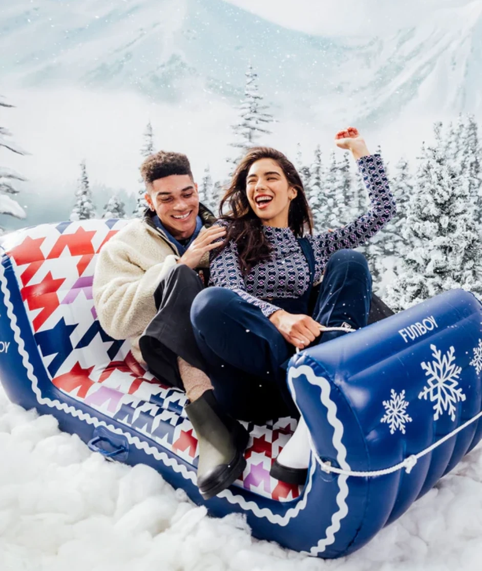 Selling a brand new FUNBOY Houndstooth Winter Sleigh! It's a luxury inflatable snow sled, still in its original box. This sled is engineered with ultra-thick snow material and a reinforced rubber base. It can hold up to 250 lbs and features dual handles and a pull rope for easy maneuvering on the snow.