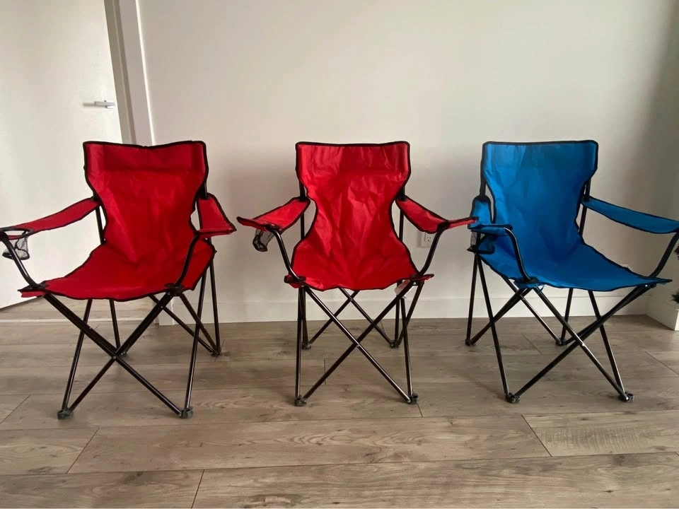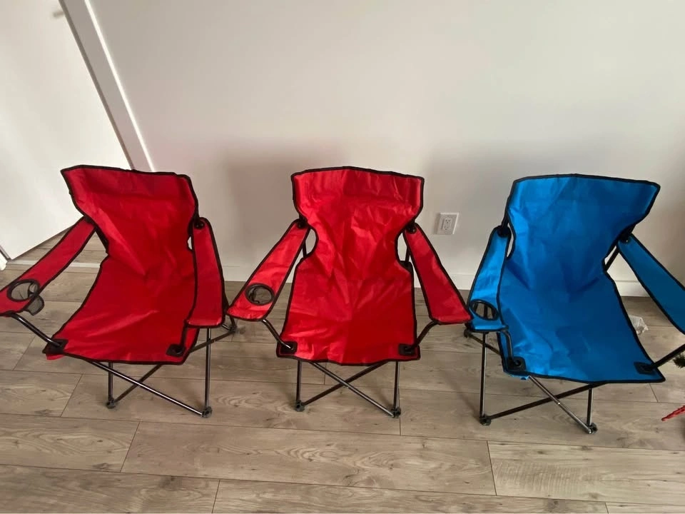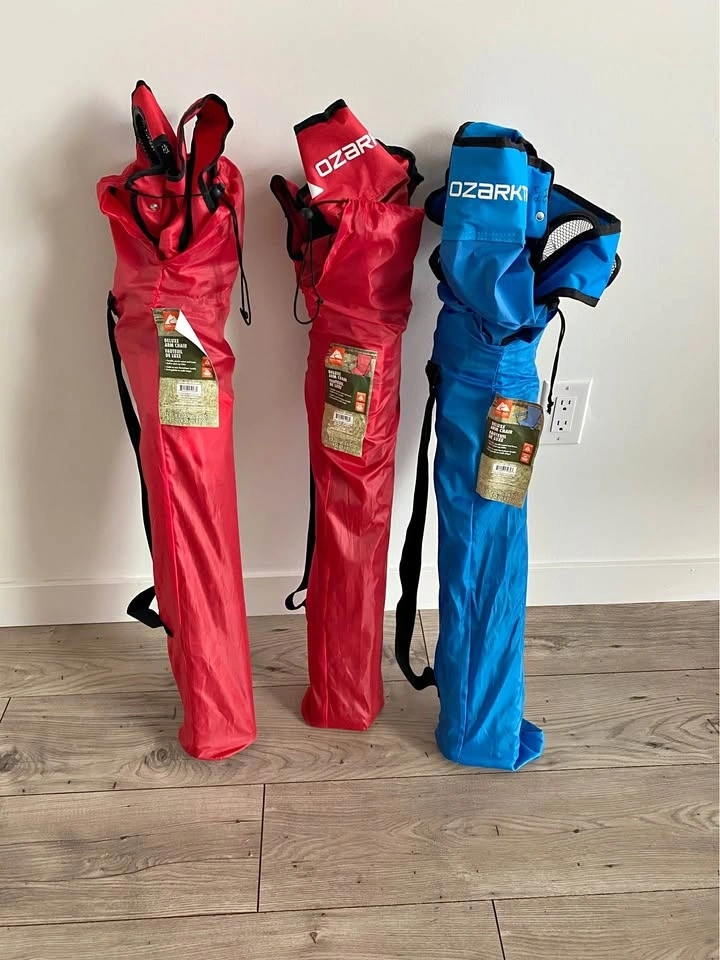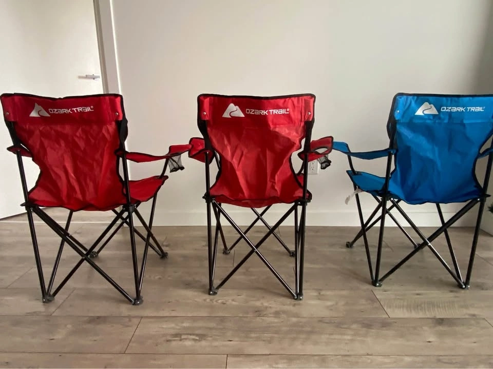 Brand new Ozark Trail camping chairs, 2 red and 1 blue. Foldable design with carrying bags.