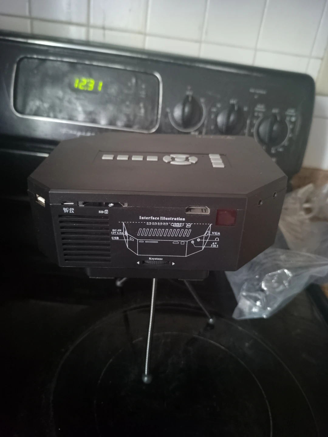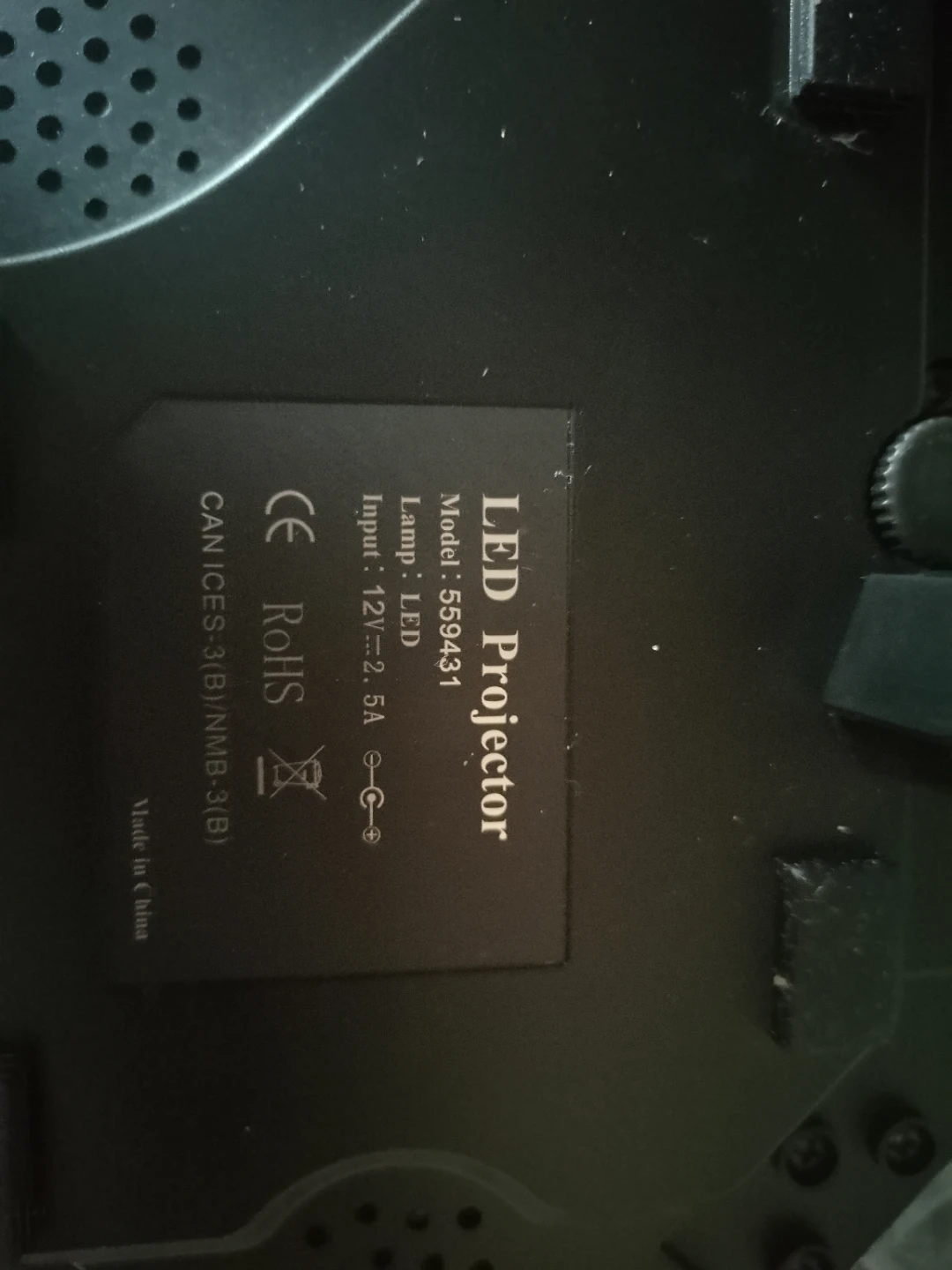 Selling an LED Projector, model number 559431. It has various input options including HDMI, VGA, SD, and USB. The projector requires 12V-2.5A input power.