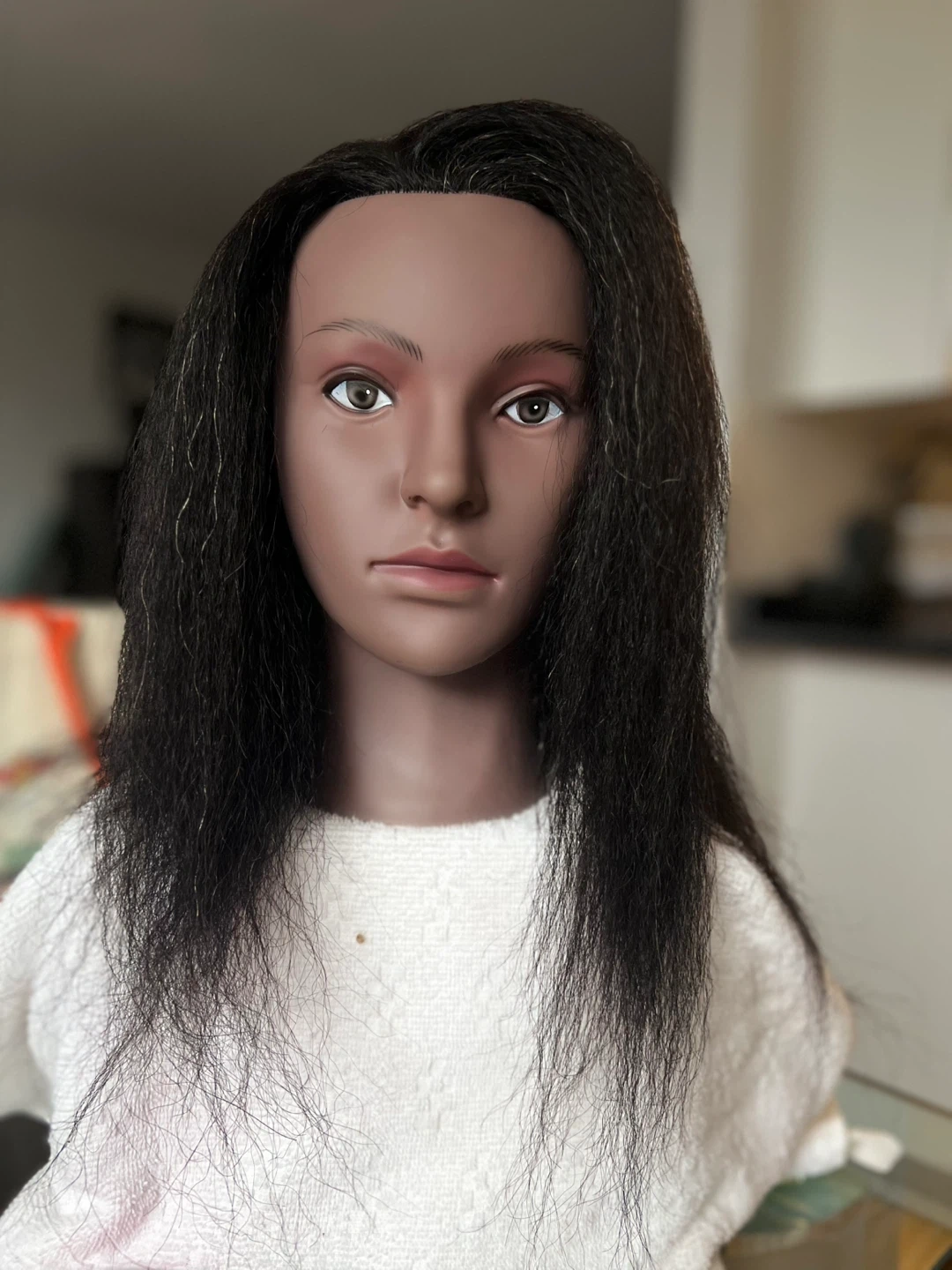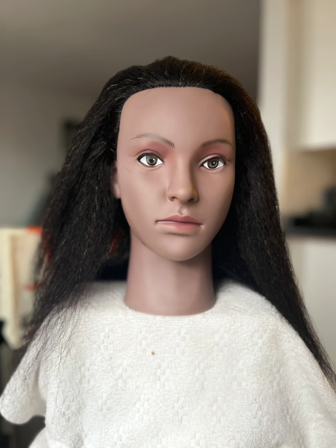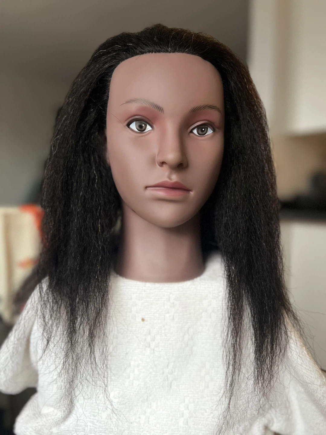 High-quality mannequin head with realistic facial features and textured, dark hair. Ideal for braiding practice, wig making, styling, cutting, or cosmetology training. Hair is securely rooted and suitable for sectioning and styling.