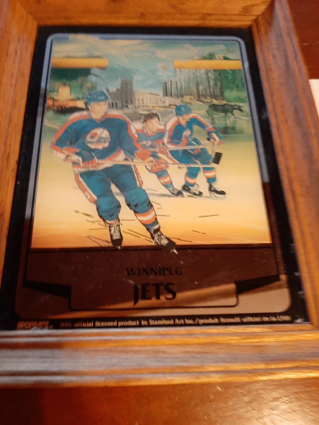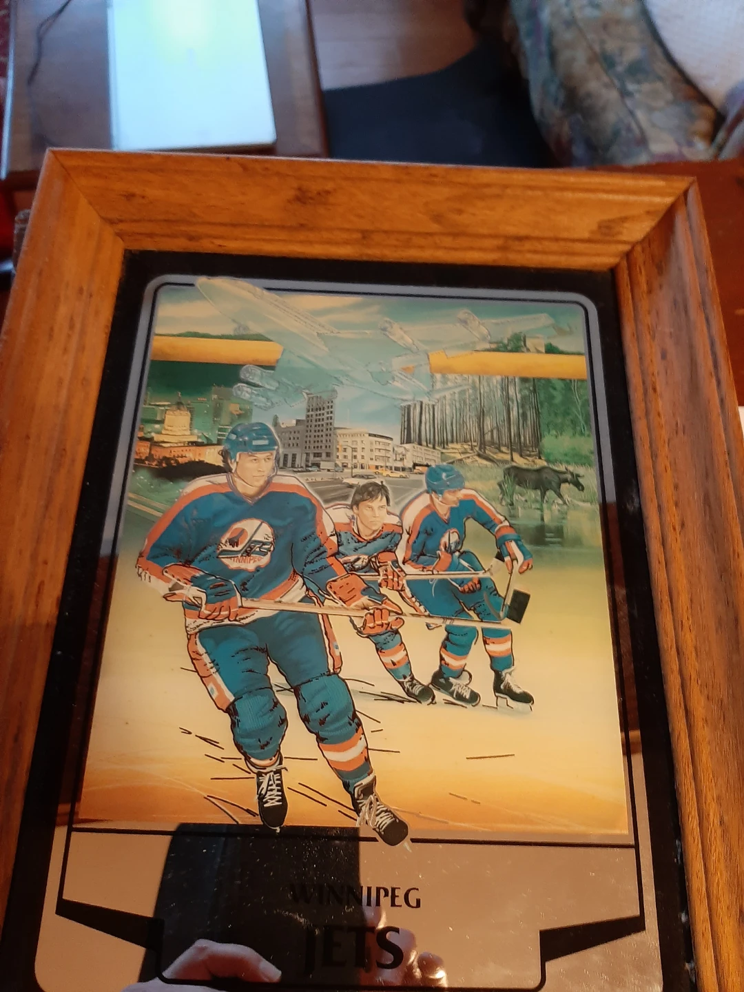 This NHL licensed art from late 70s, early 80s is available free. It has Winnipeg Jets players skating on ice, a Jet above, Canadian Moose and is free to someone who might appreciate it.