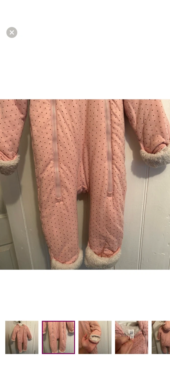 Gap brand. Double zipper Sherpa lined bunting suit with fold over feet & hands. Pink polka dot. Size 6/12m. Brand new condition