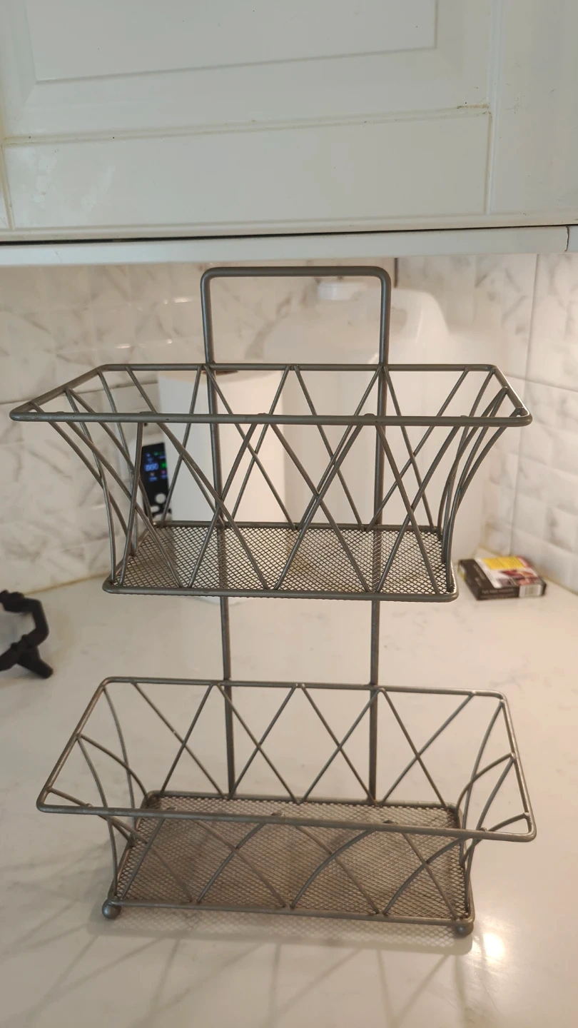 Here's a handy two-tier metal wire basket stand! It's perfect for organizing items in your kitchen or bathroom. The stand has a rustic, industrial look and is in good condition.