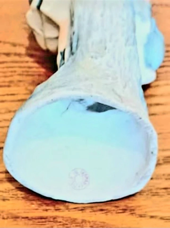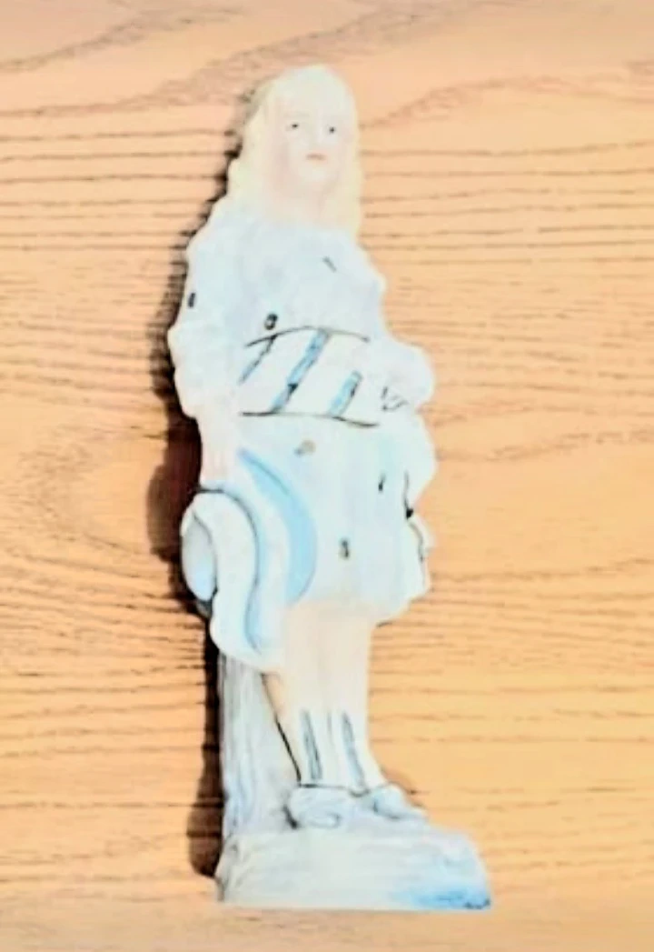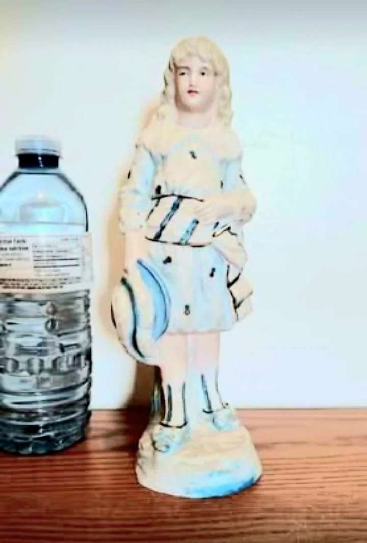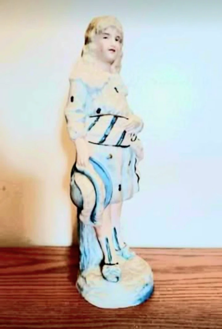 This rare vintage German ceramic statue features a charming blue boy, standing 10 inches tall and is intricately hand-painted with a textured finish.