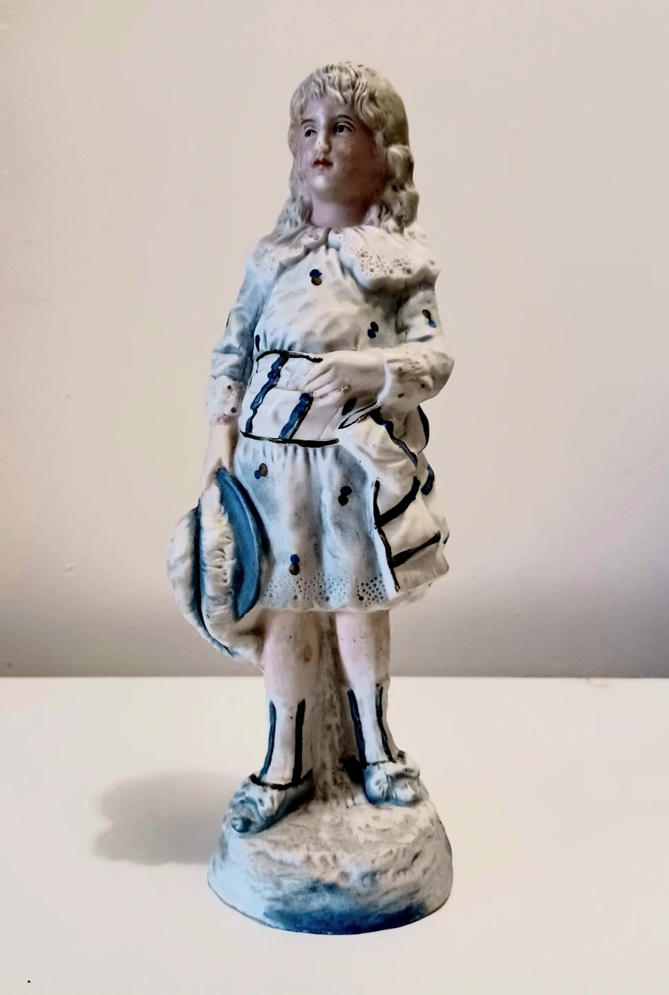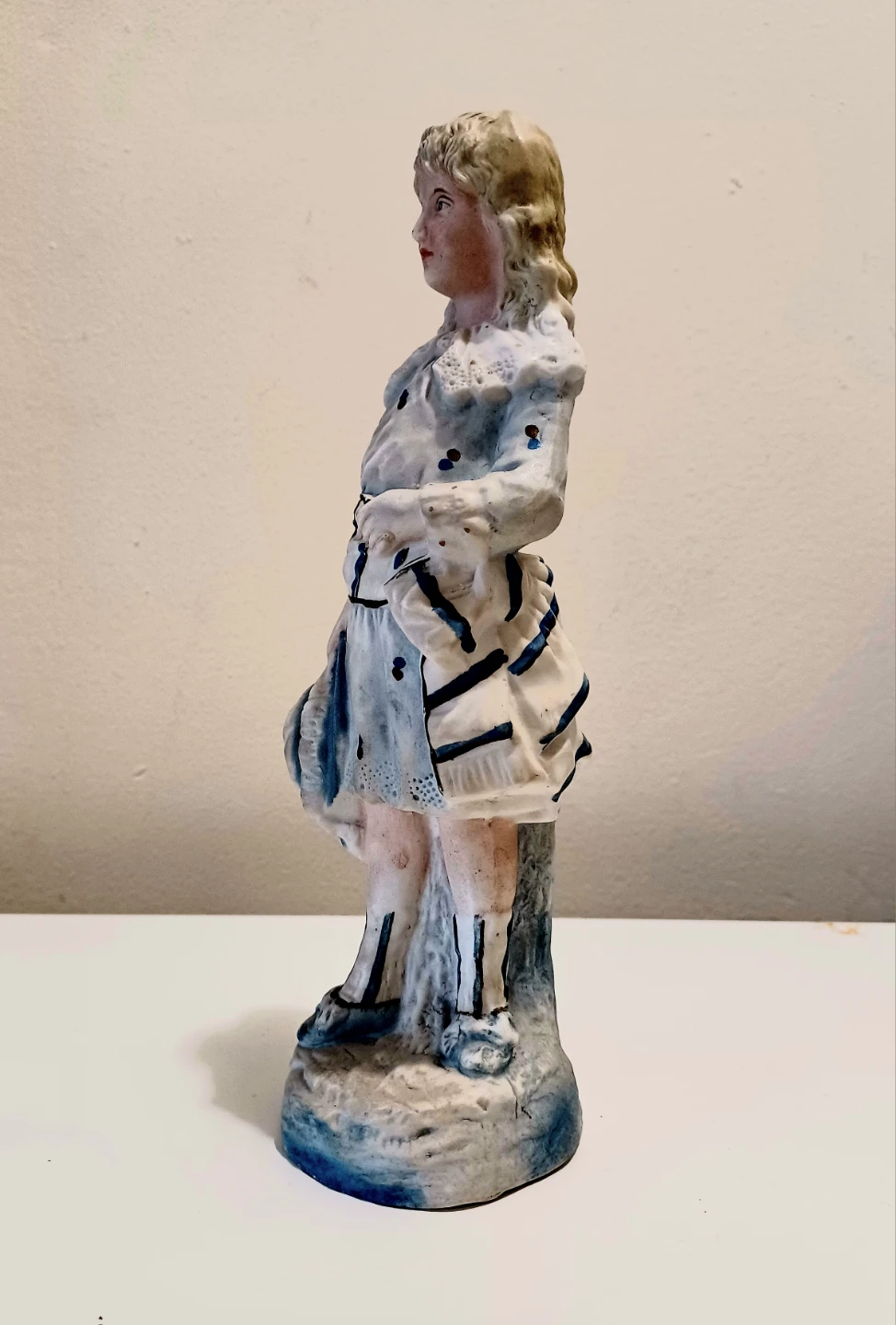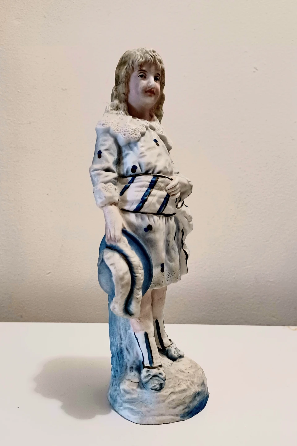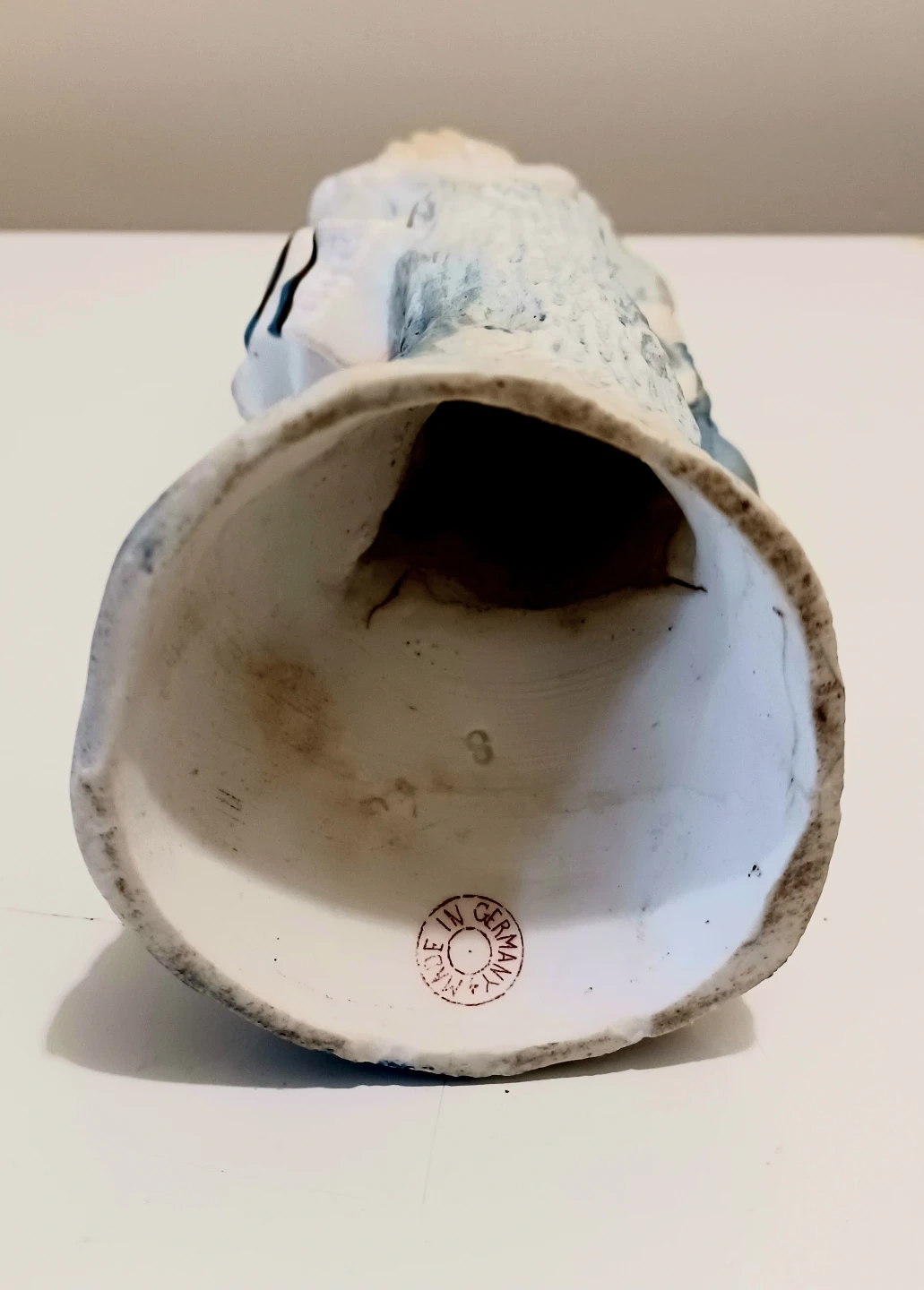 Rare vintage German ceramic statue features a charming blue boy, intricately hand-painted with a textured finish.