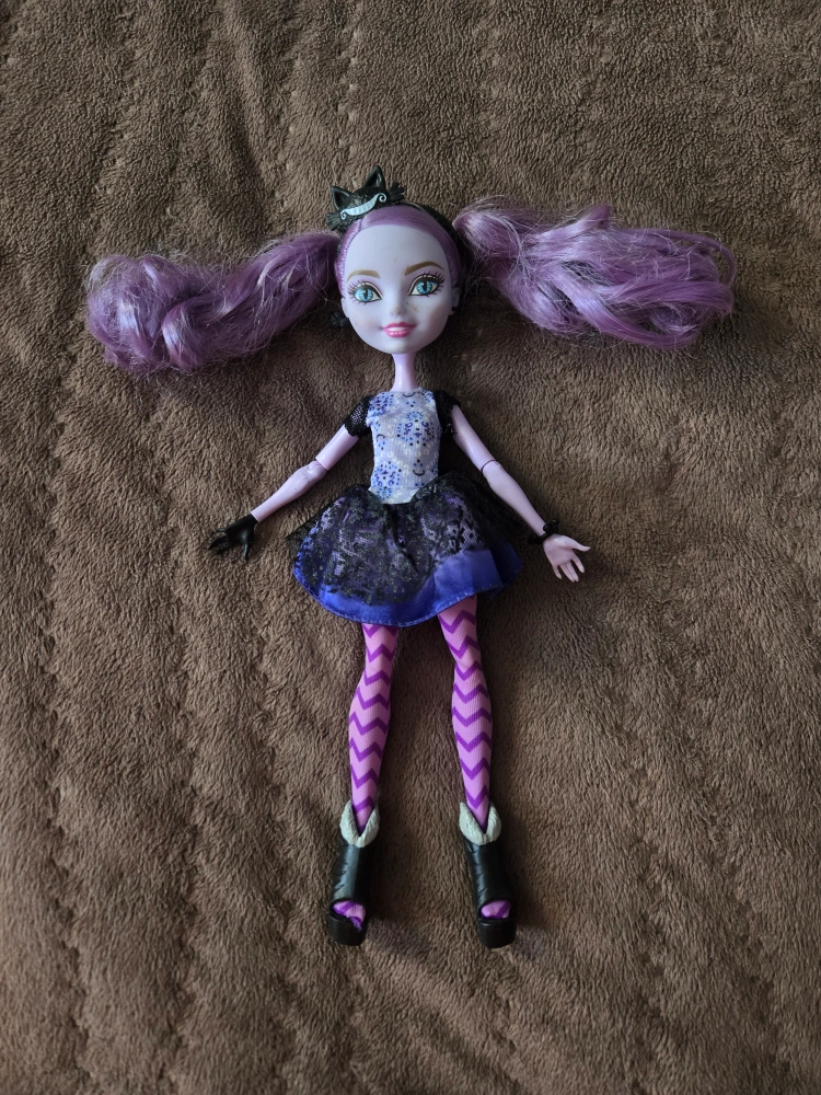 Very old original Kitty Chesire ever after high doll, missing their hand replaced with another. a bit dirty from being well loved and played with, perfect for restoring, doll customization or collecting.