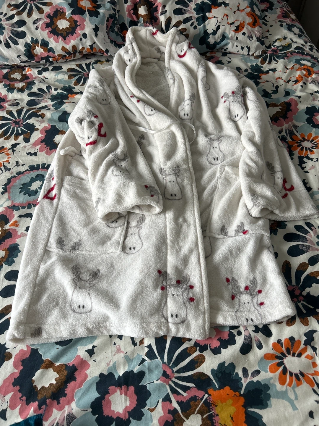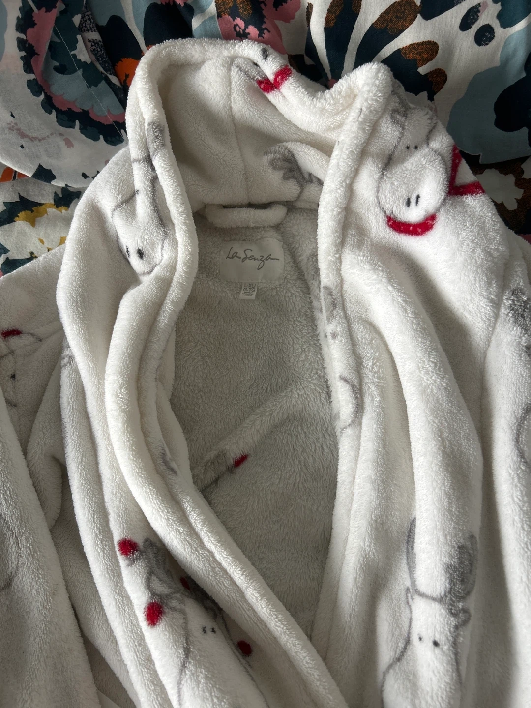 Cozy white robe from La Senza! It features a cute reindeer pattern and is a size L/G. Perfect for lounging around the house
