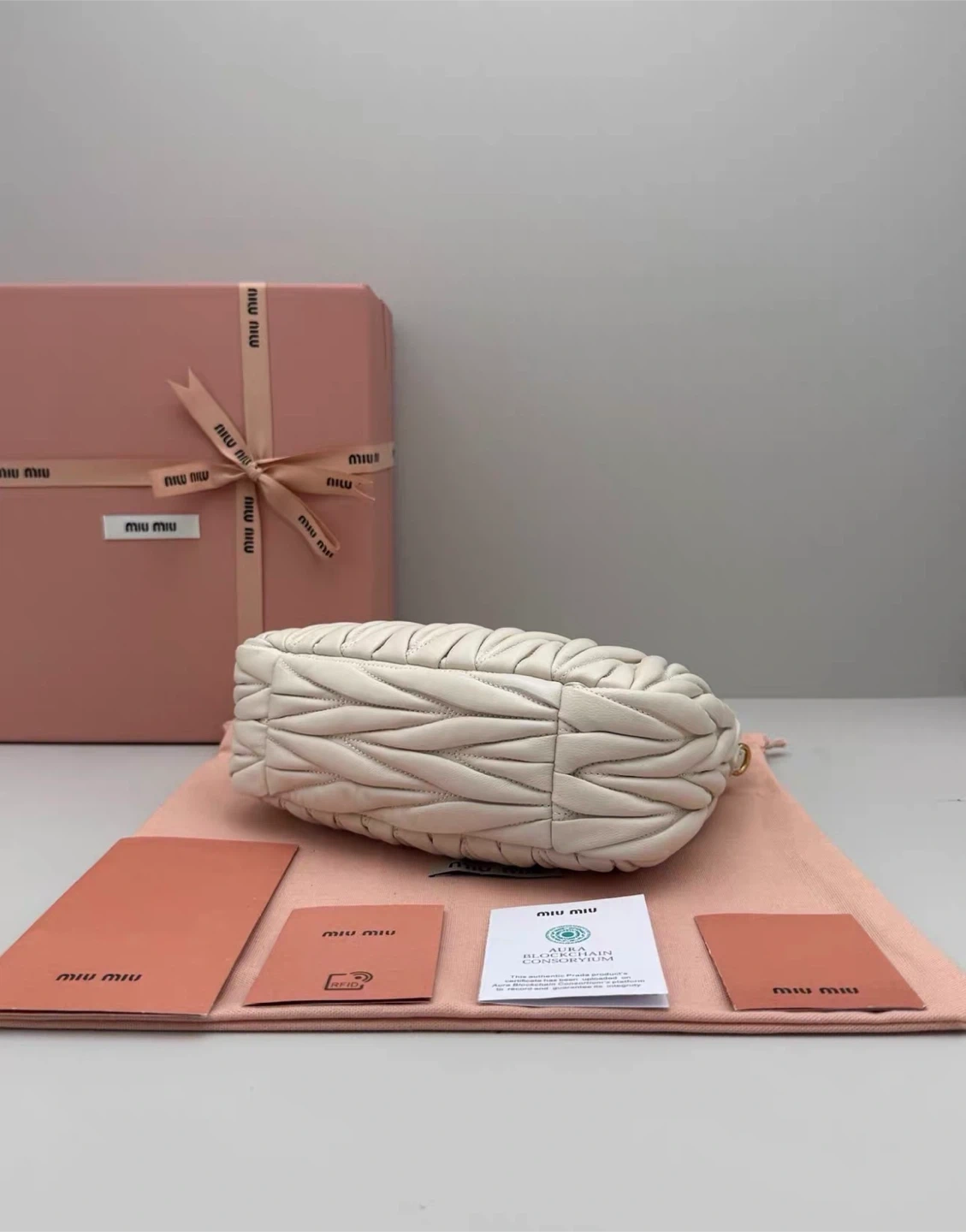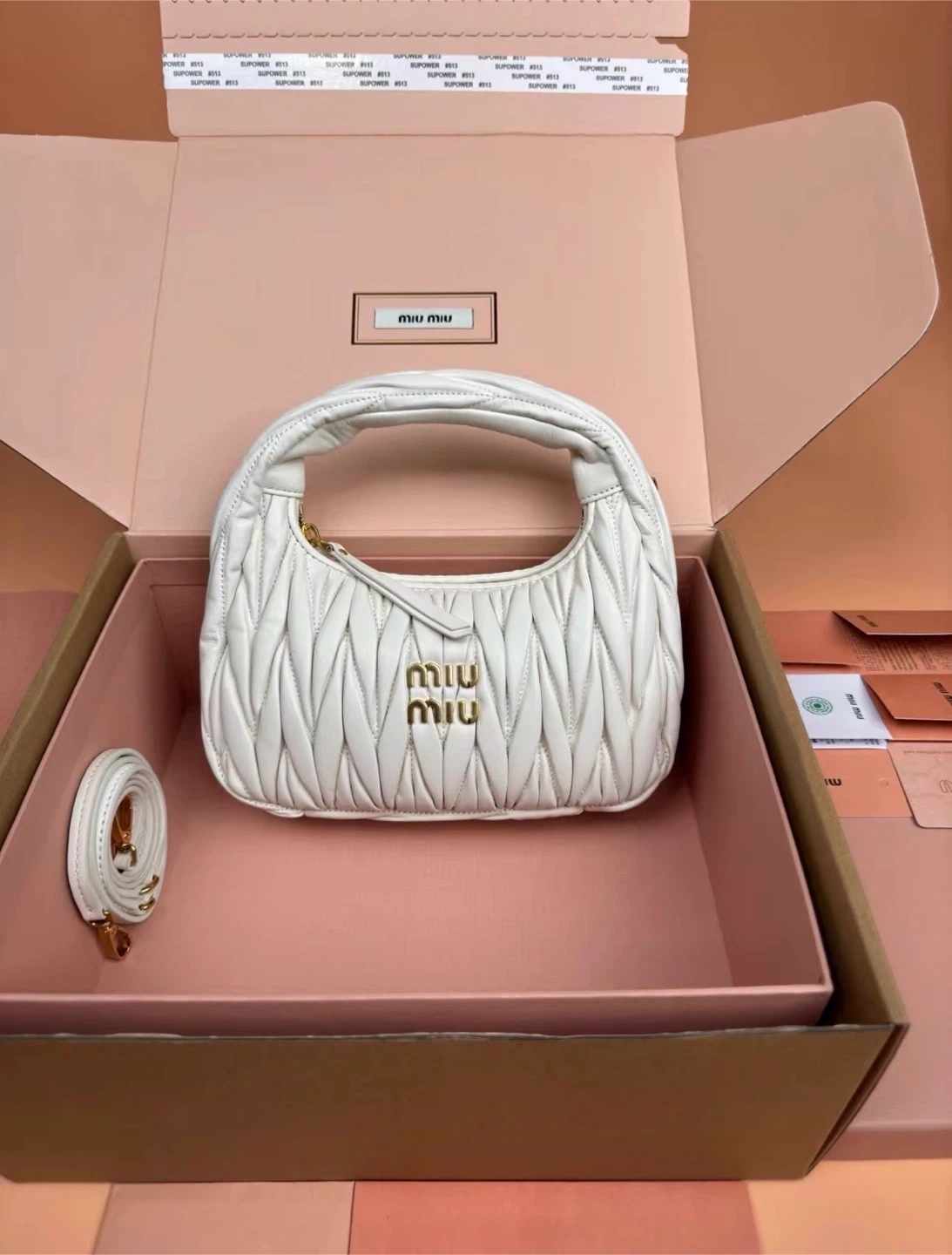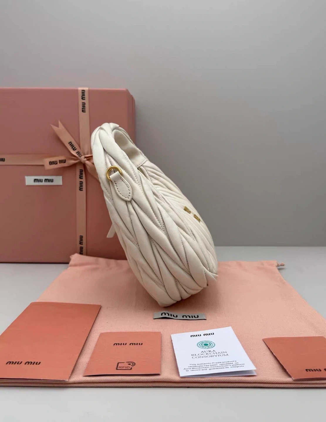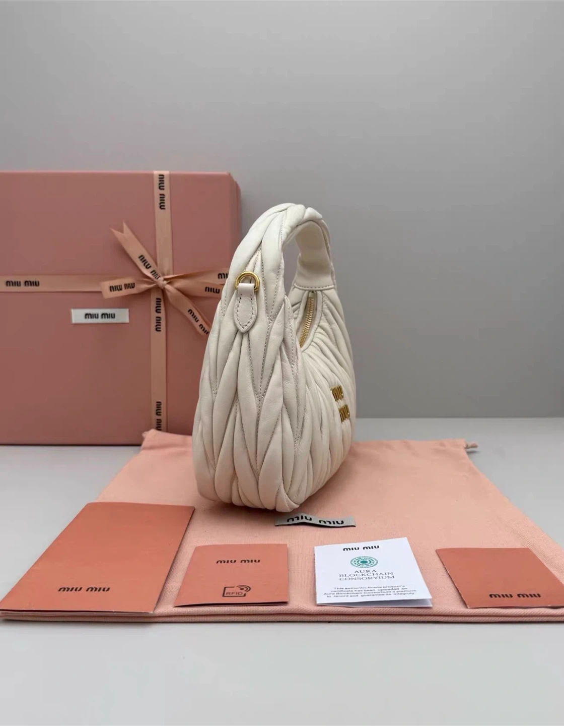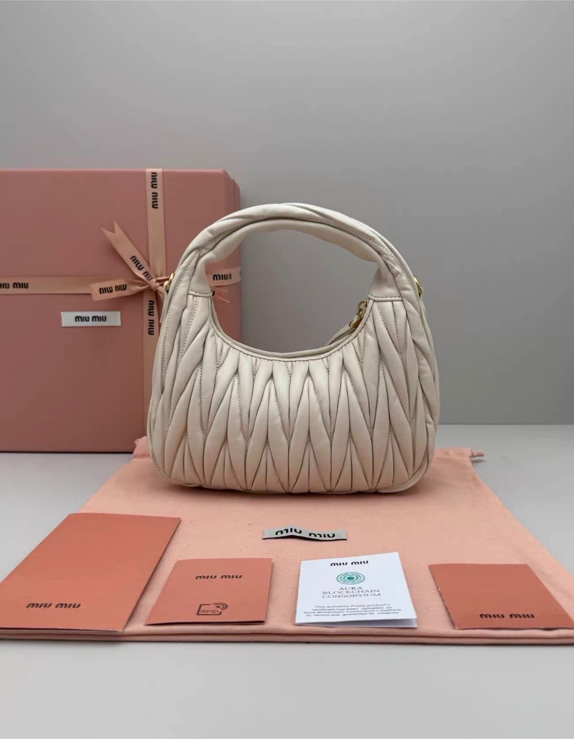 Selling a brand new Miu Miu Matelassé Mini Hobo Bag in white leather! It comes with its original box and all the included cards. This stylish bag is perfect for adding a touch of elegance to any outfit