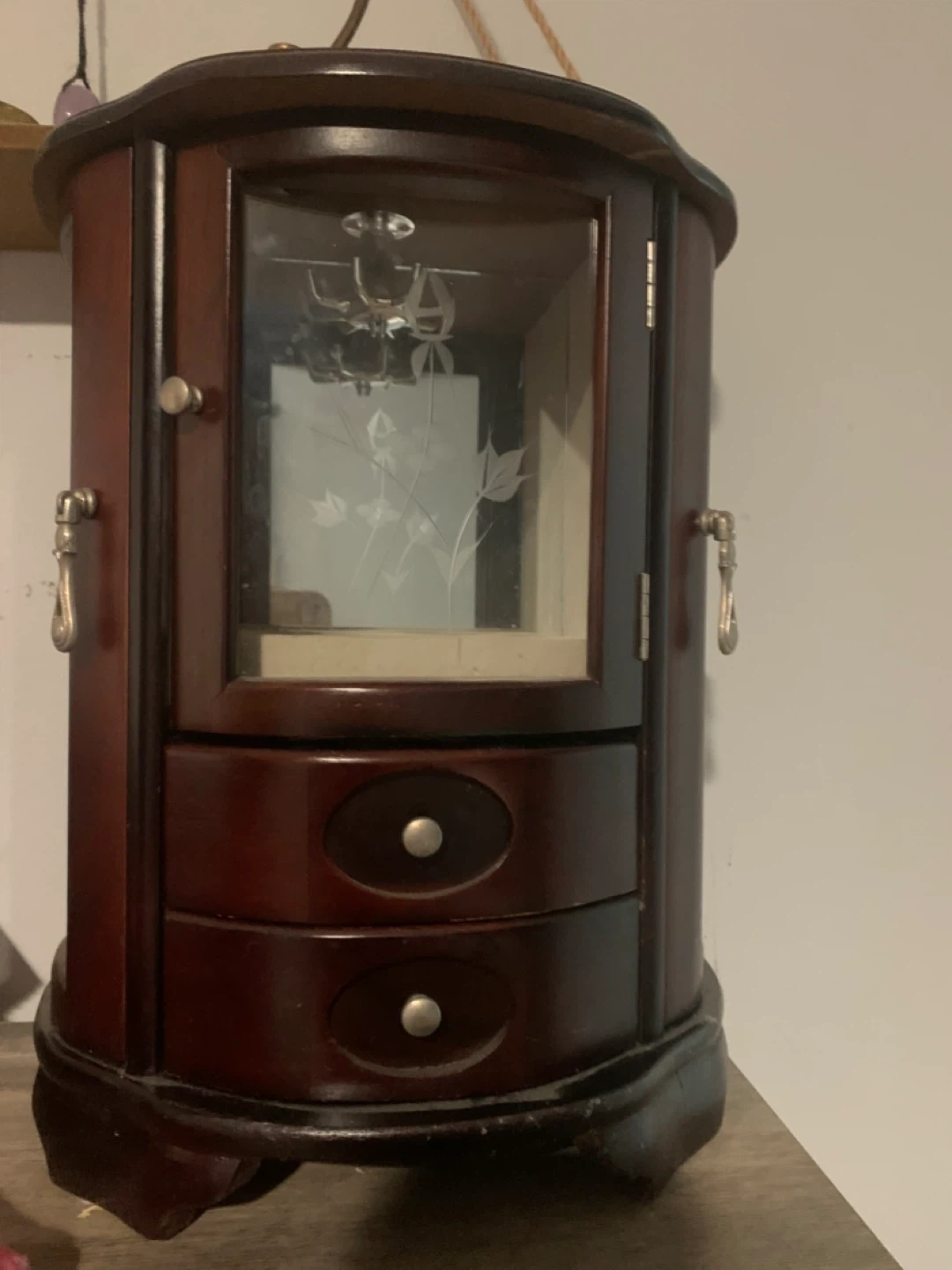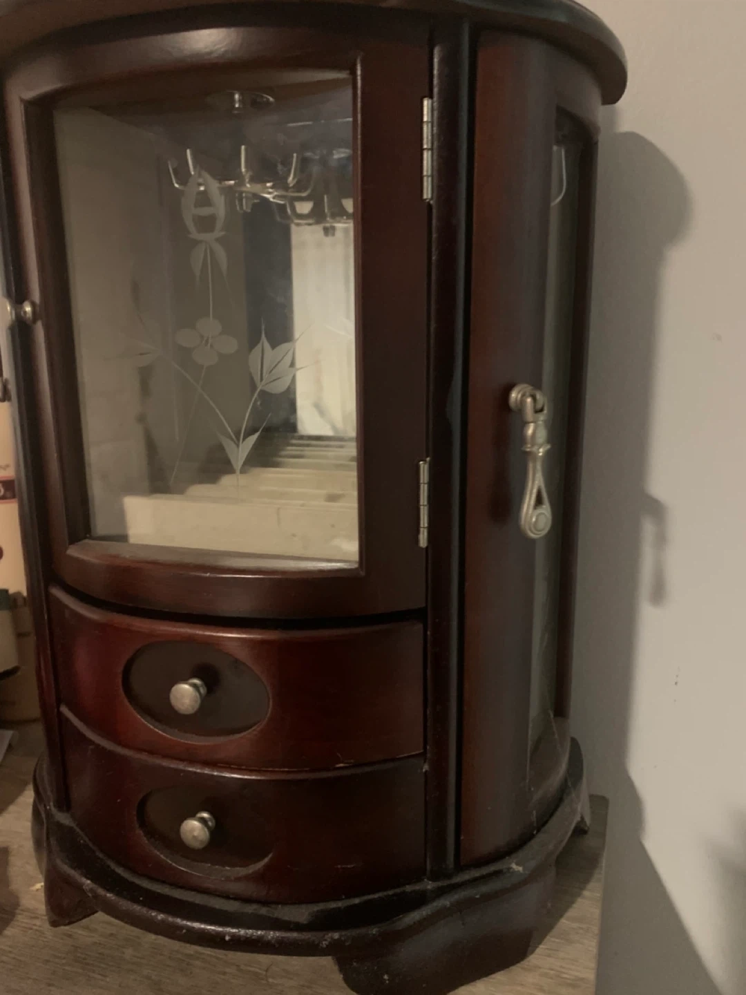 This is a lovely wooden jewelry box, perfect for storing your precious items! It features a glass door with a floral design, and two drawers for extra storage. It's a great way to keep your jewelry organized and safe.