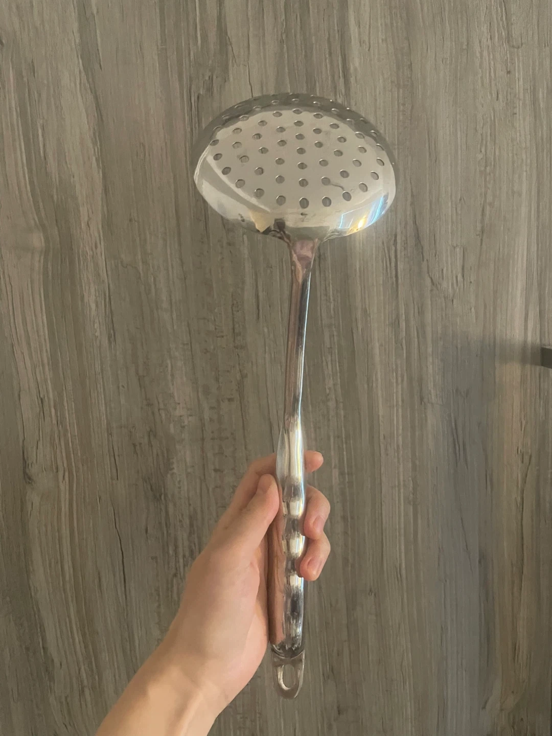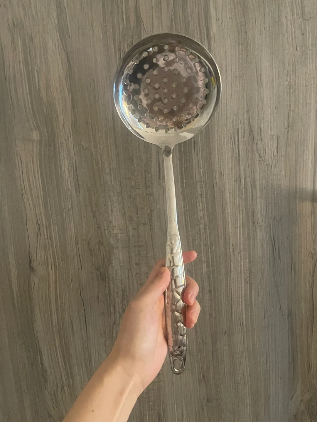 Selling a stainless steel skimmer spoon. It's in great condition and ready for a new kitchen! Perfect for straining pasta or scooping up dumplings