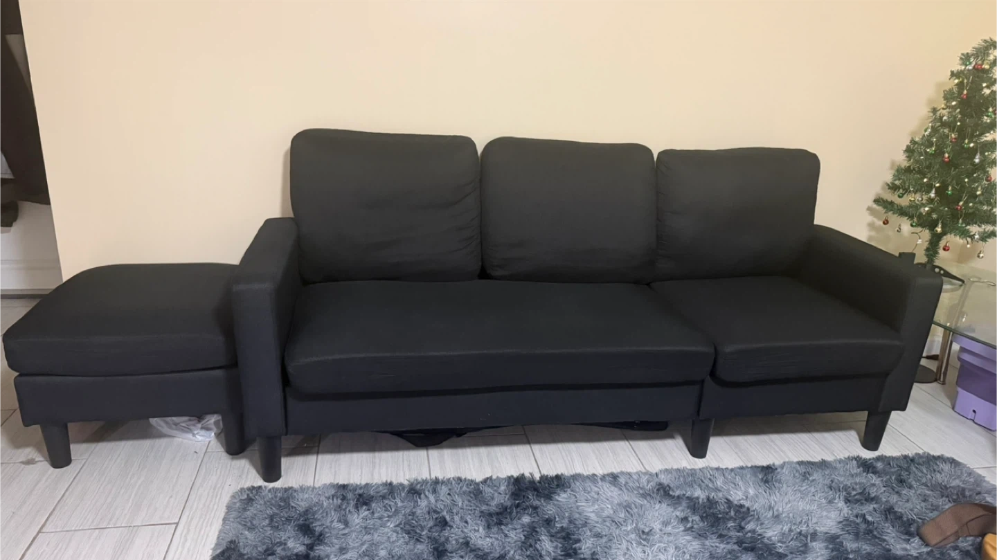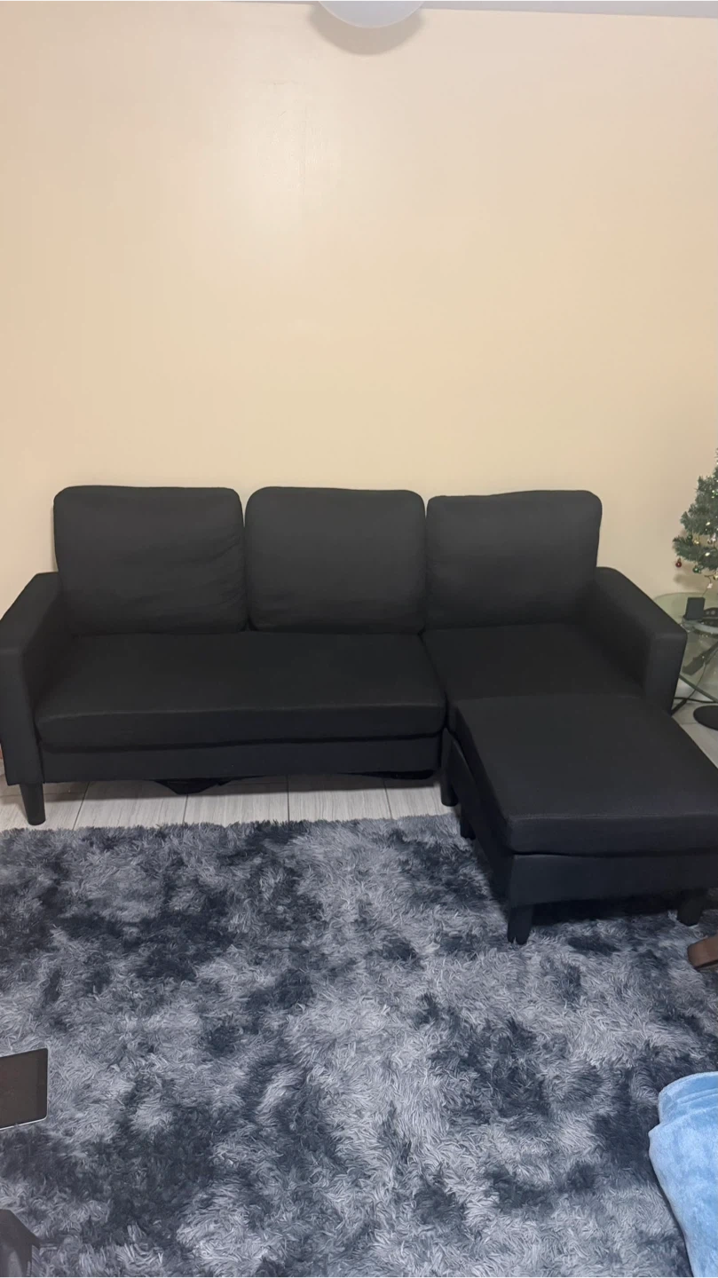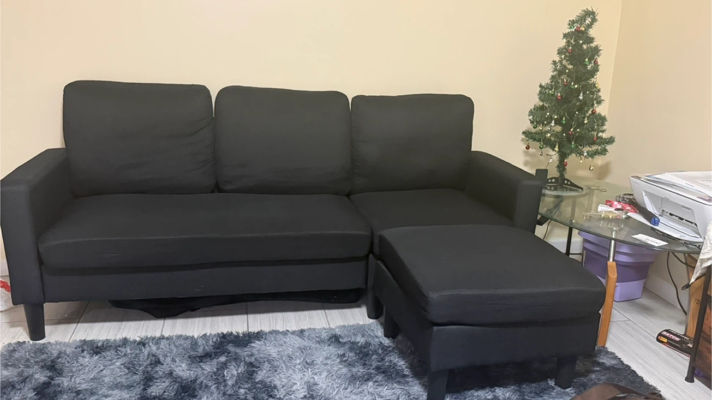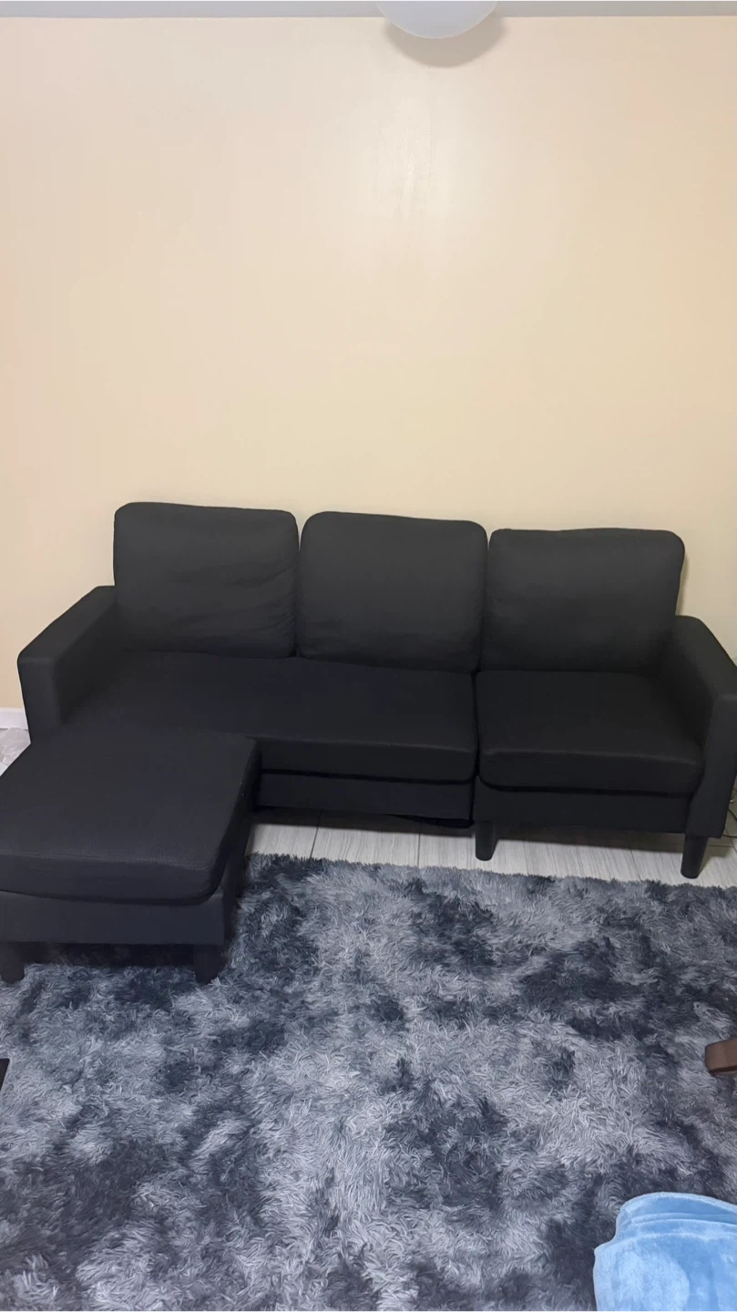 Selling a black sectional sofa with an ottoman. It's in good condition and would be a great addition to any living room!