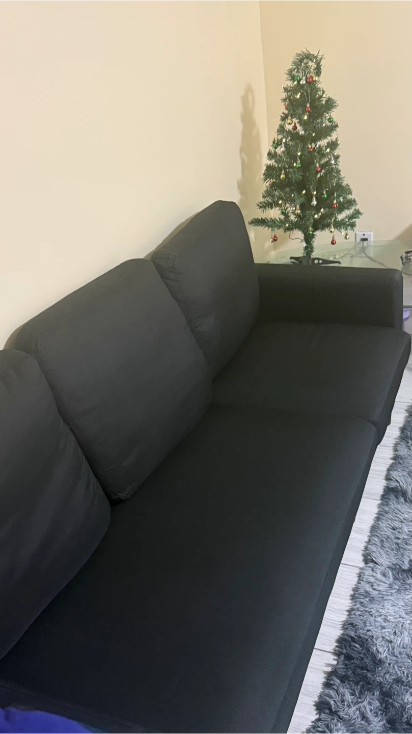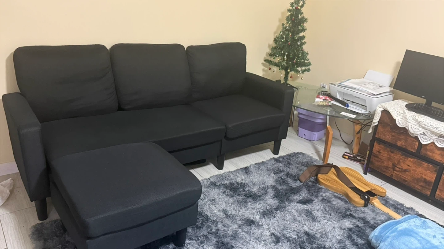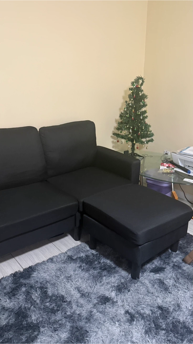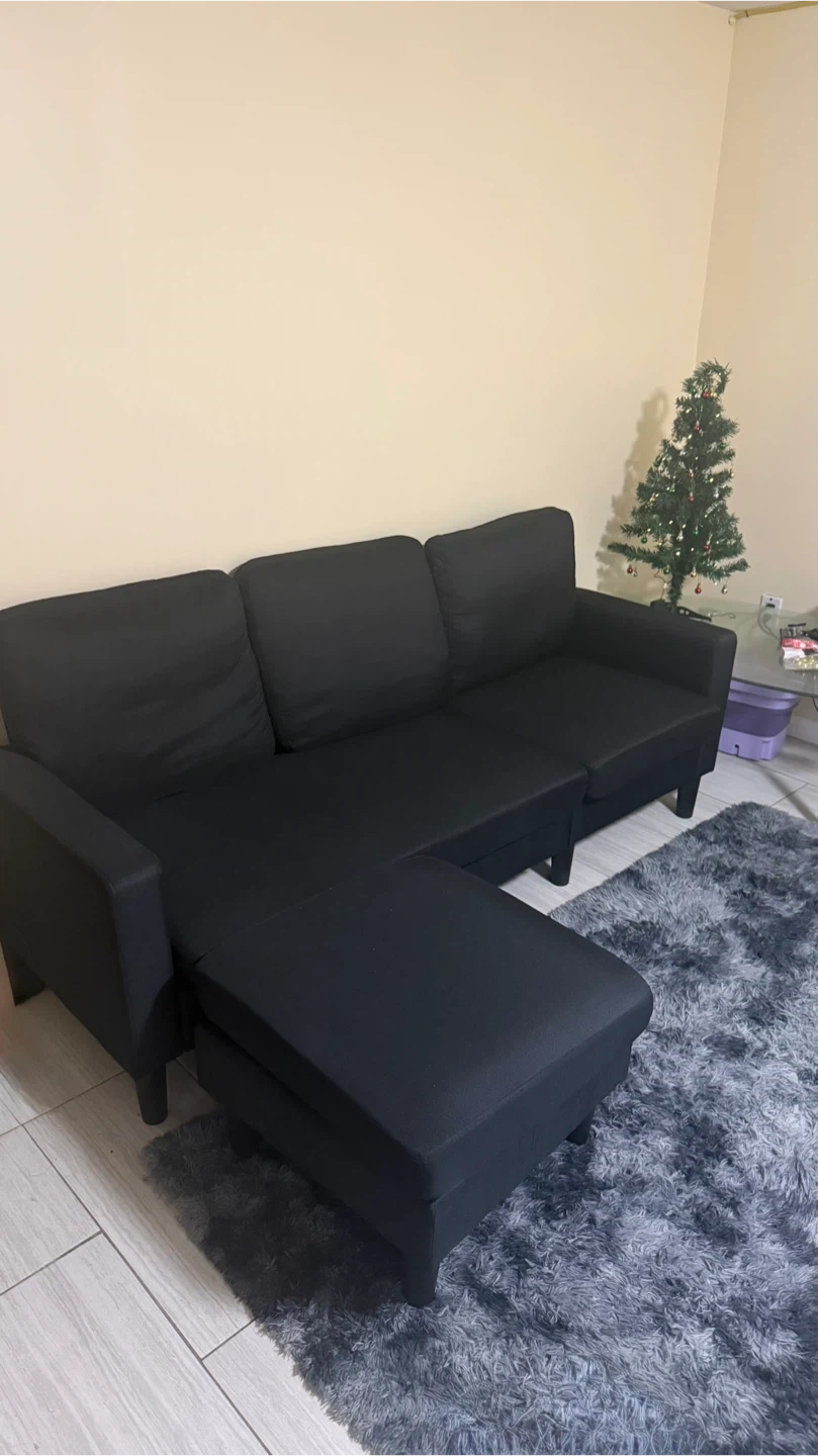 Selling a black sectional sofa with an ottoman. It's in good condition and would be a great addition to any living room!