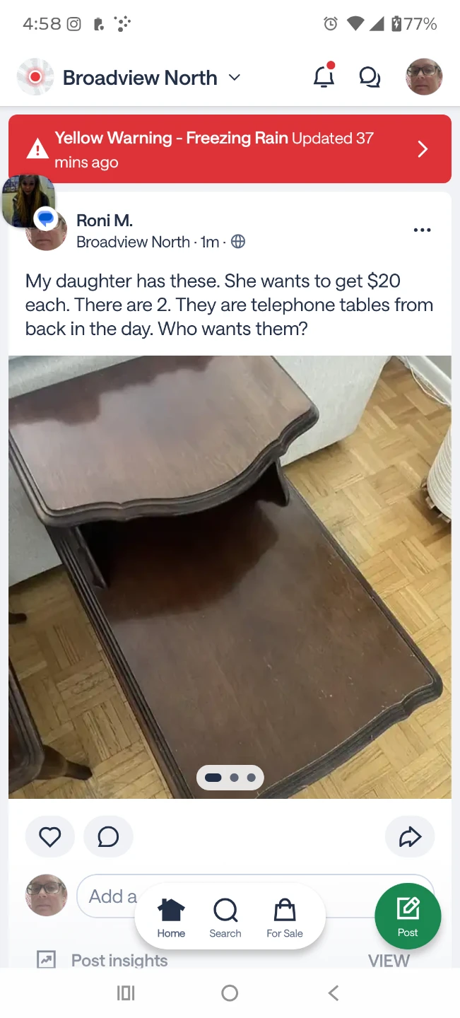 Selling a set of two vintage telephone tables. They're in good condition and would add a touch of retro charm to any room. $20 each.