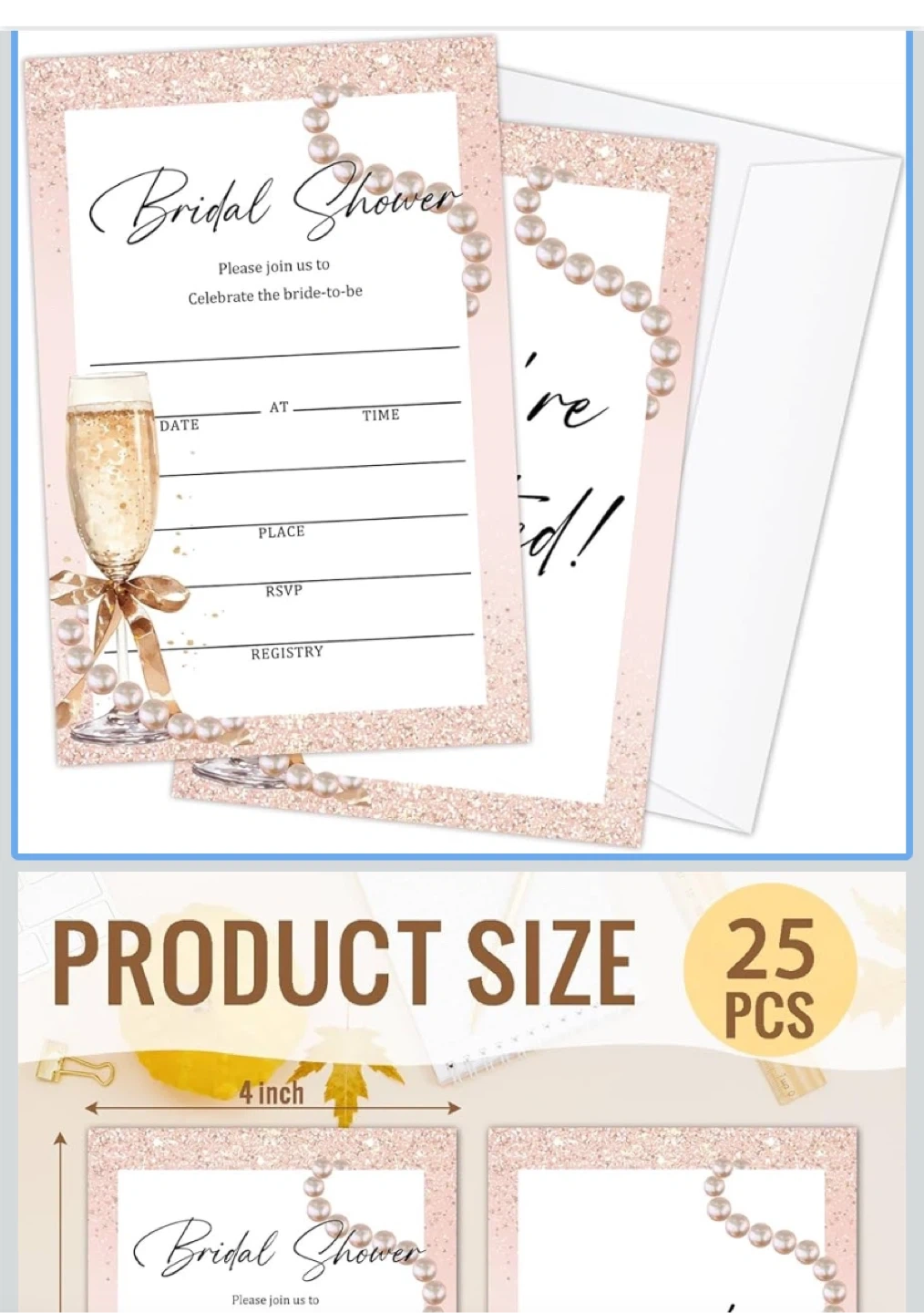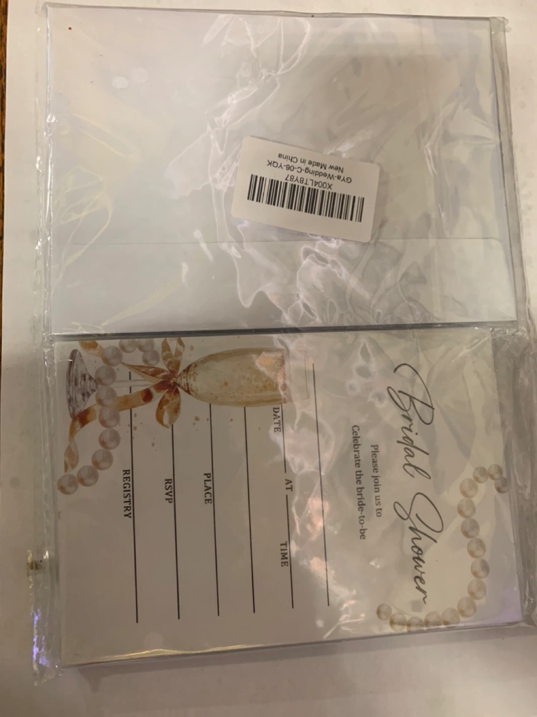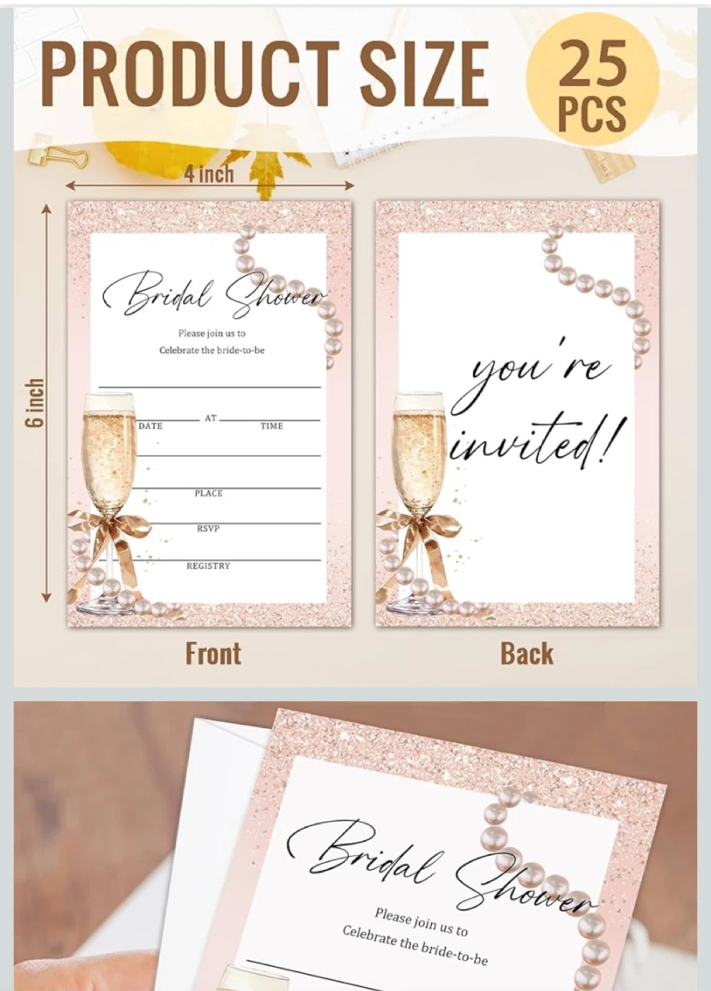 I'm selling a set of 25 bridal shower invitation cards. They're brand new and still in the original packaging! The cards are 4x6 inches and feature a champagne glass design with pearl accents. Perfect for celebrating the bride-to-be