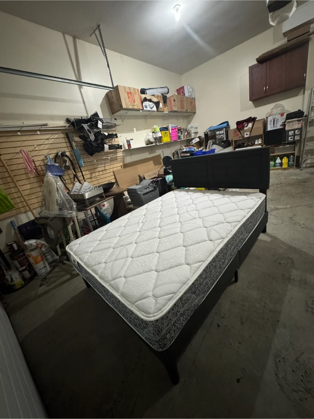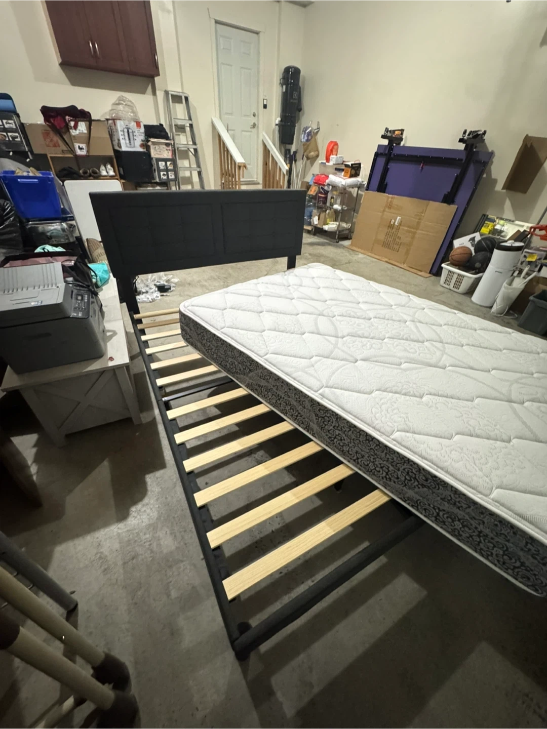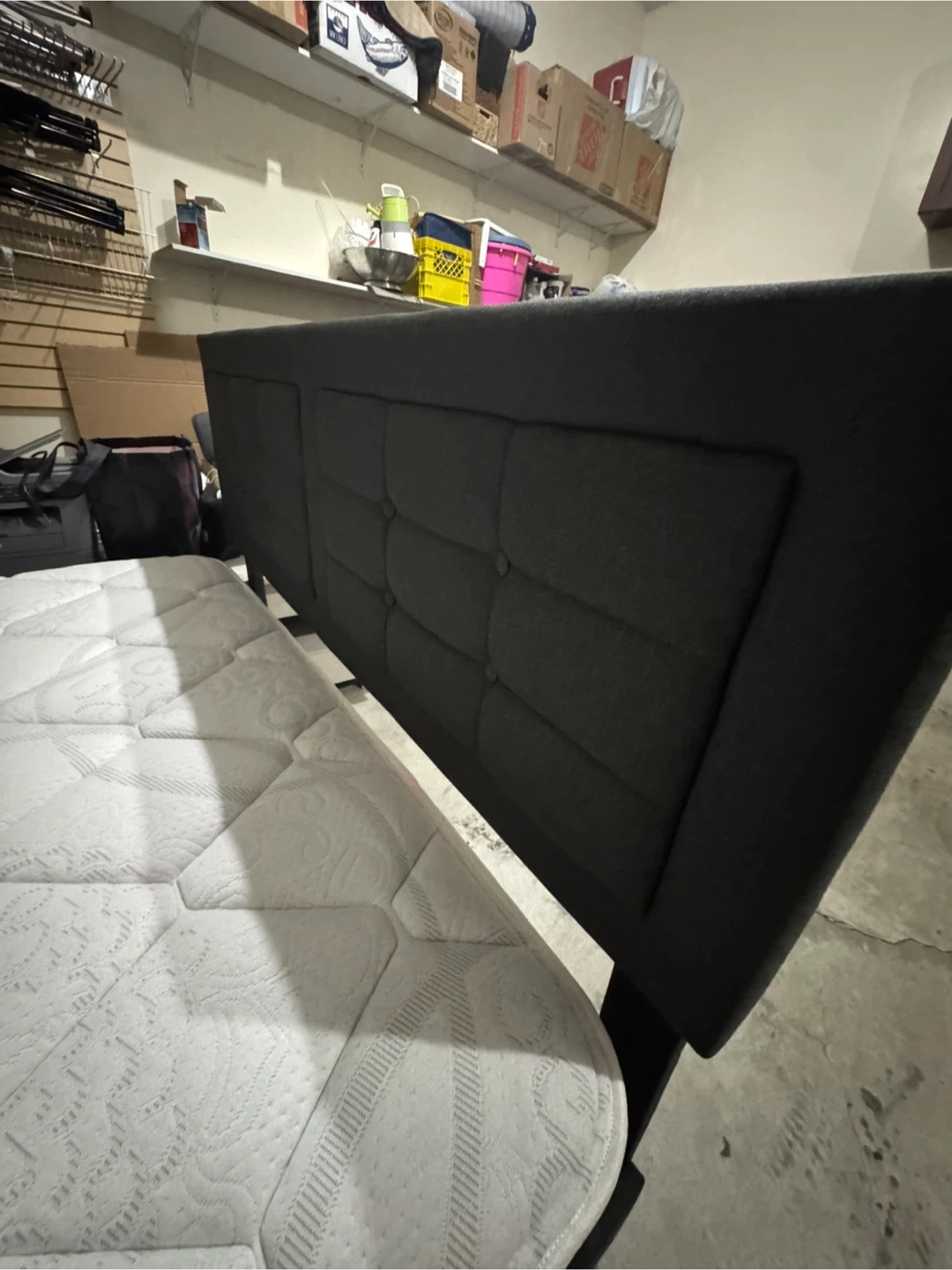Selling a dark grey bed frame with a mattress. It's in great condition and ready for a new home. Perfect for a bedroom upgrade!