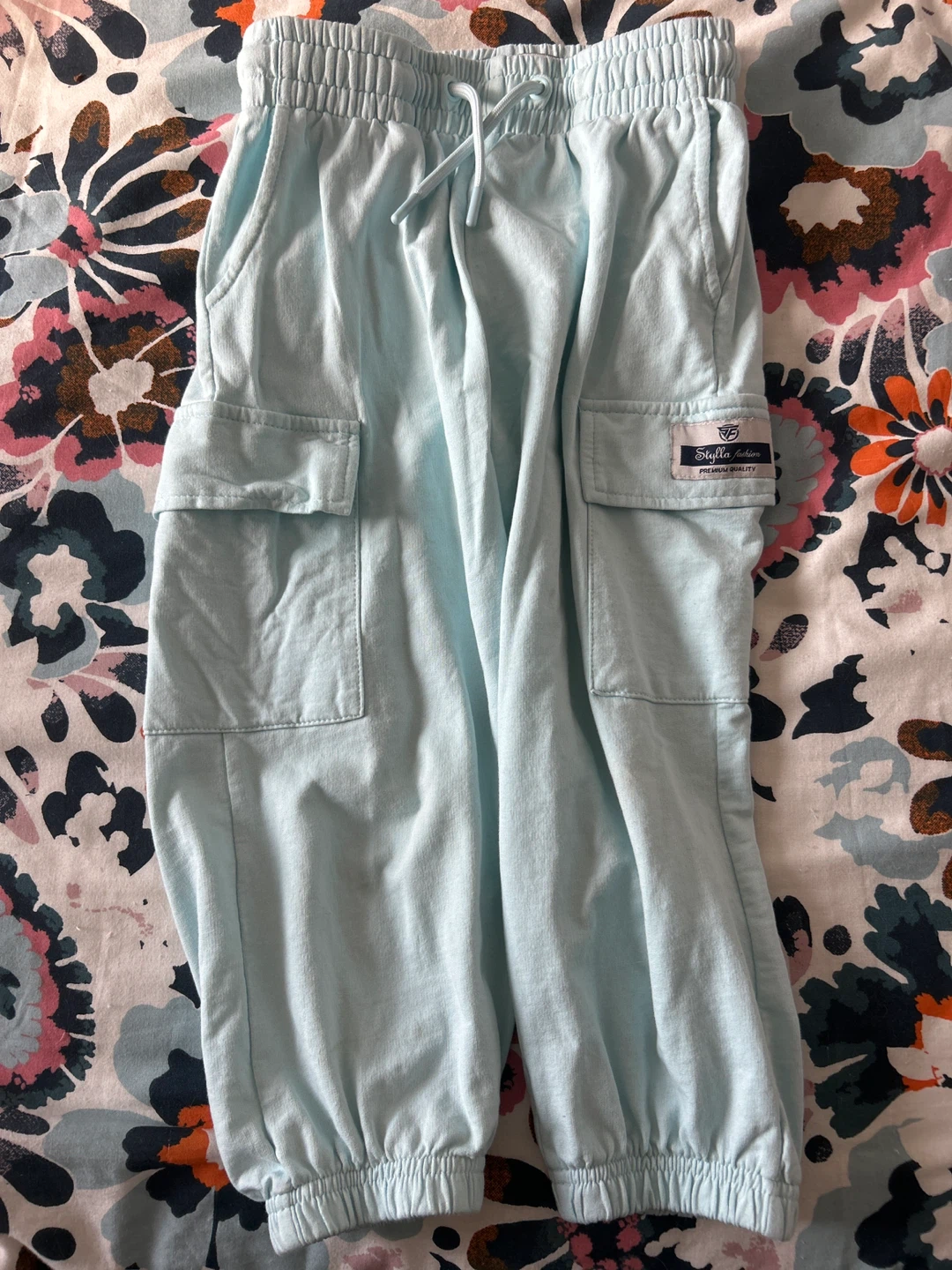Selling a pair of light blue jogger pants from Stylla Fashion. They feature a comfortable elastic waistband with a drawstring and cargo pockets on the sides. Great for casual wear!
