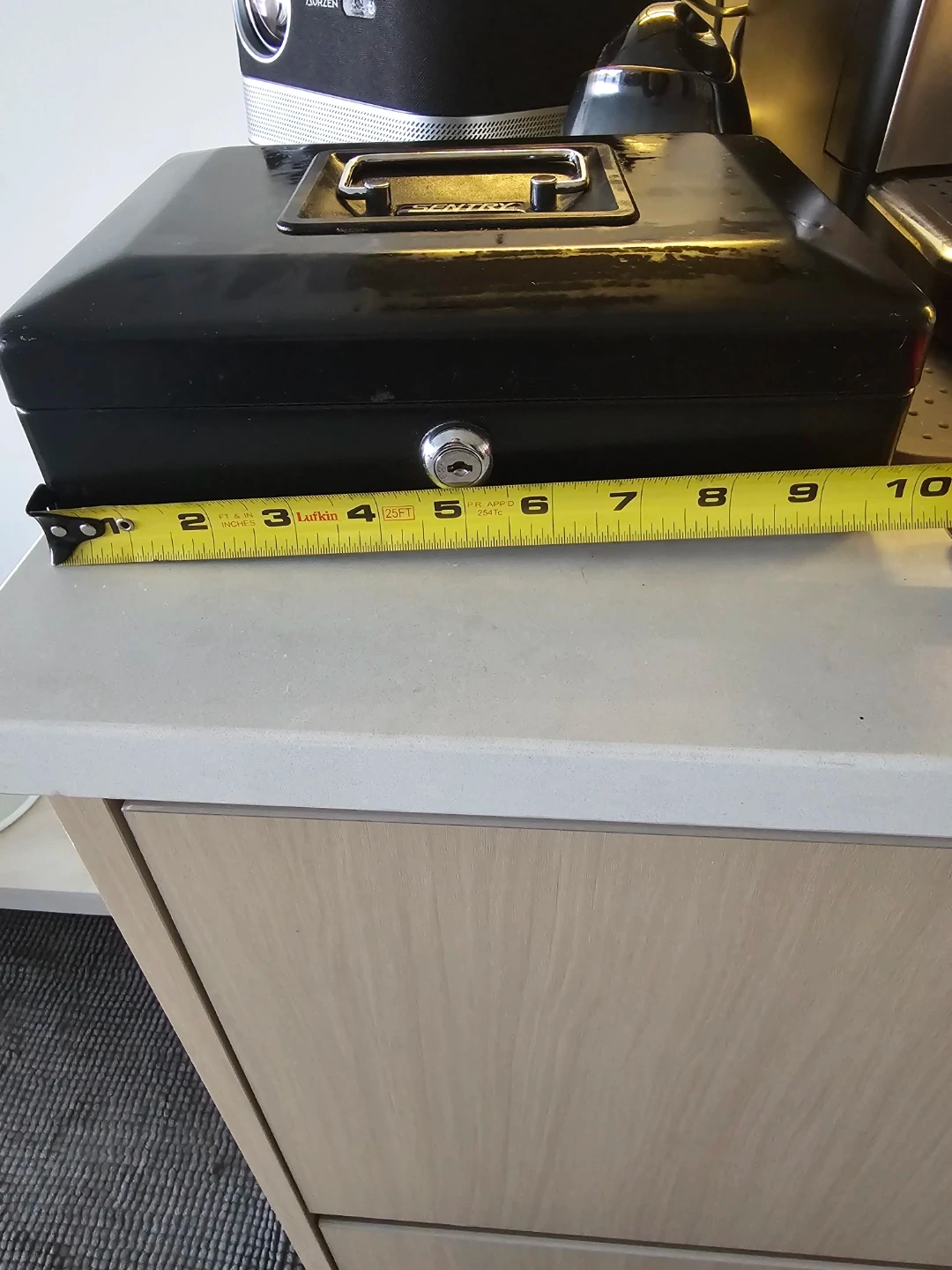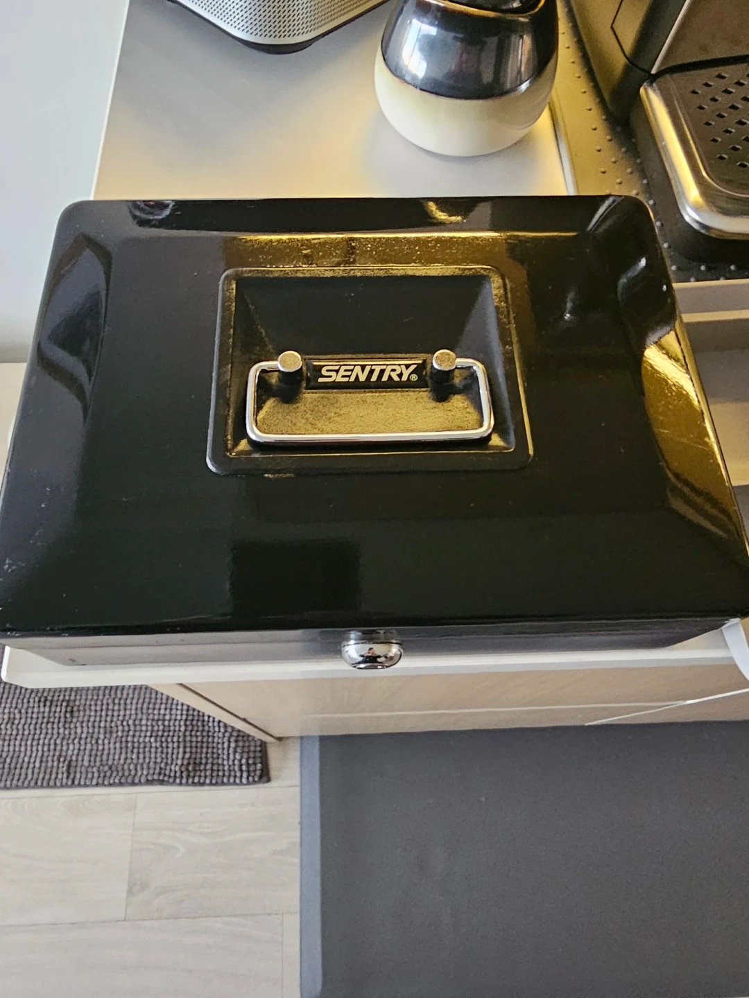 Selling a Sentry safe box in black, good working condition. Comes with 1 key. Will also throw in rollers for coins