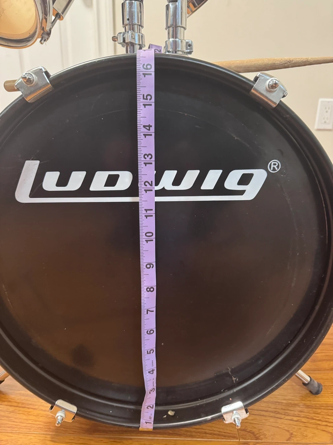 Selling a Ludwig drum set, perfect for beginners or experienced drummers alike! The set appears to be in good condition and includes all the essential components to get you started. The bass drum measures approximately 16 inches in diameter.